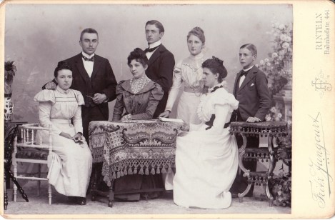 This family portrait was photographed by Fritz Jungcurt, in Rinteln, Germany. All of the members of this family are very well dressed and also wear very serious facial expressions. They look like they’ve gathered together for an austere occasion.
