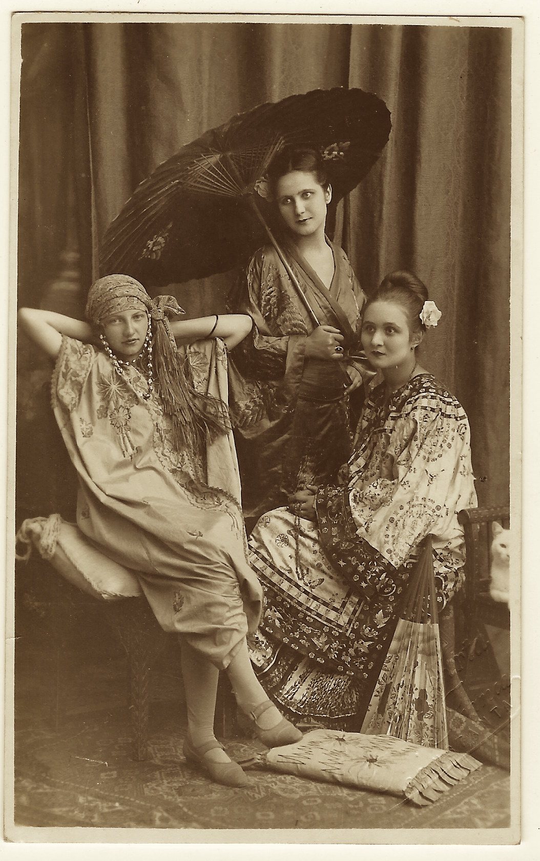 This vintage real photo postcard has a number of interesting features. The women are posed on a fabric covered bench. They are dressed in noteworthy attire. One is wearing a nautical type outfit while the other is dressed in a kimono styled pant suit, or possibly pajamas. I wish I knew the story of these two women. What was the nature of their relationship? Sisters? Lovers? Due to the passage of time, the story has to be whatever we imagine it to be. This photograph was taken by the Foto Rembrandt studio in Bucharest, Romania. Viewing the photographers ink stamp on the reverse of the postcard, leads me to believe that the photographer was A. Maza. The stamp box indicates that the postcard was published by K Ltd sometime between 1918 and 1936. At least one postcard collector has posited that K Ltd may actually be the maker of the paper that the postcard is printed on. SOLD