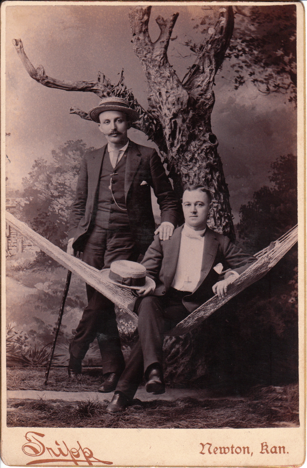 Two affectionate men pose for their portrait in Newton, Kansas. The men look quite dapper in their suits and with their straw hats. Note that the gentleman wearing the suit and vest has a pocket watch chain visible atop his vest. He is also holding a walking stick.The man standing, and the man sitting on the hammock are showing some shared affection. They could be friends, relatives, or even lovers. It is impossible to guess their relationship. One wonders if homophobia was much of a factor in the cabinet card era in regard to men showing affection to men in public or in photographs. Perhaps a visitor to the cabinet card gallery can competently comment on this issue. The photographer of this image is the Tripp studio in Newton, Kansas. According to print on the reverse of the photograph, the studio was located on the corner of Main Street and Broadway. The photographer, Frank D. Tripp is cited in Anthony’s Photographic Bulletin (1896) as the President of the Photographers Association of Kansas. Another source states that Tripp “flourished” as a photographer in Newton during the 1880’s. Tripp’s obituary appears in The Evening Kansan Republican (1947). He died in Denver, Colorado at age eighty. He was described in the article as a pioneer photographer in Newton. He was an officer in the Newton Masonic Lodge. At some point he moved to Pueblo, Colorado where he was a partner in the Tripp and York photography studio.