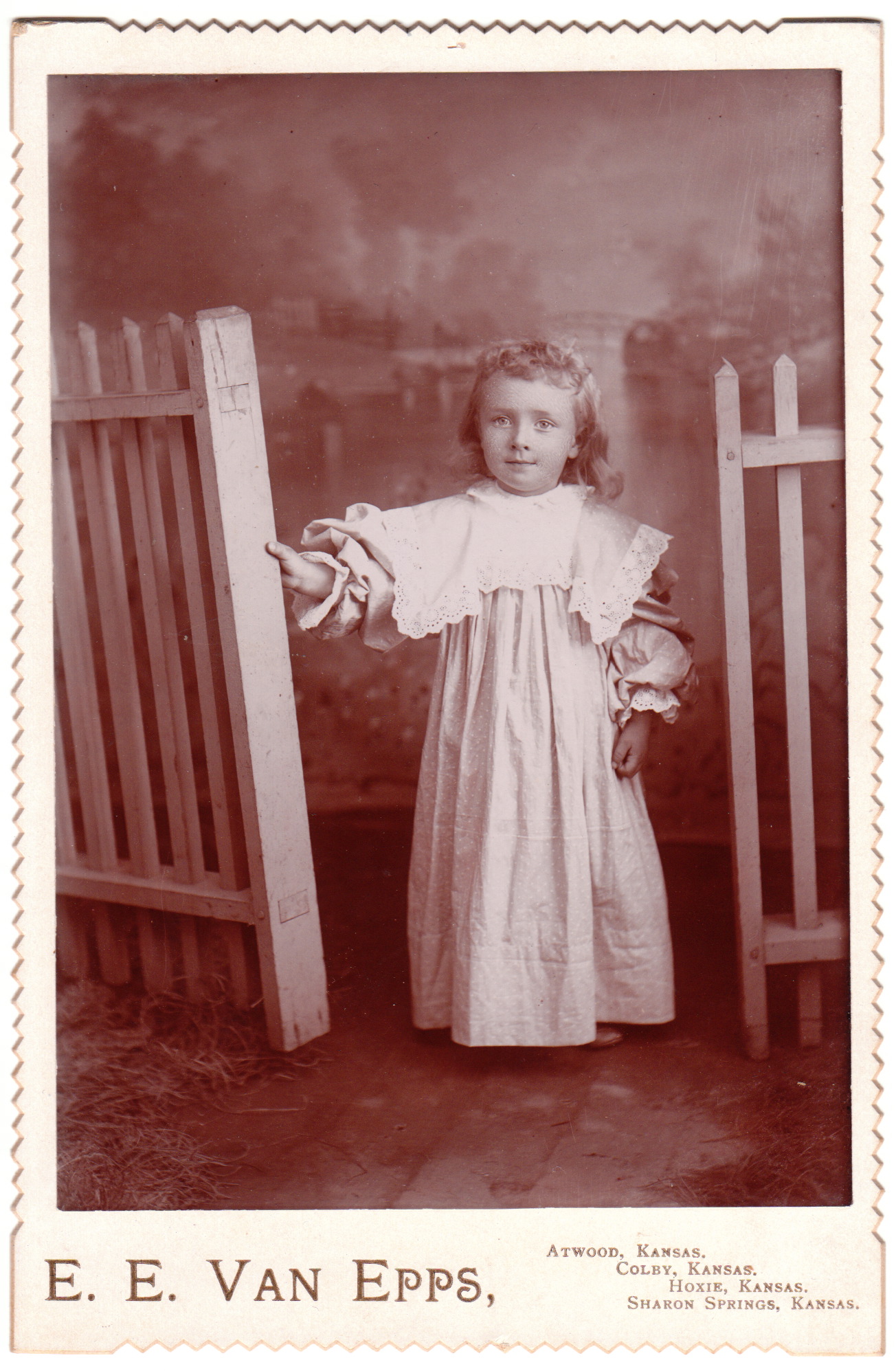 A cute little girl with a sweet smile pushes open the gate in this studio photograph by E. E. Van Epps. The child wears an expression that shows her excitement about obtaining a photographic portrait. This scalloped cabinet card was created in one of four studios operated by Van Epps in Kansas. The studios were located in the towns of Atwood, Colby, Hoxie and Sharon Springs.