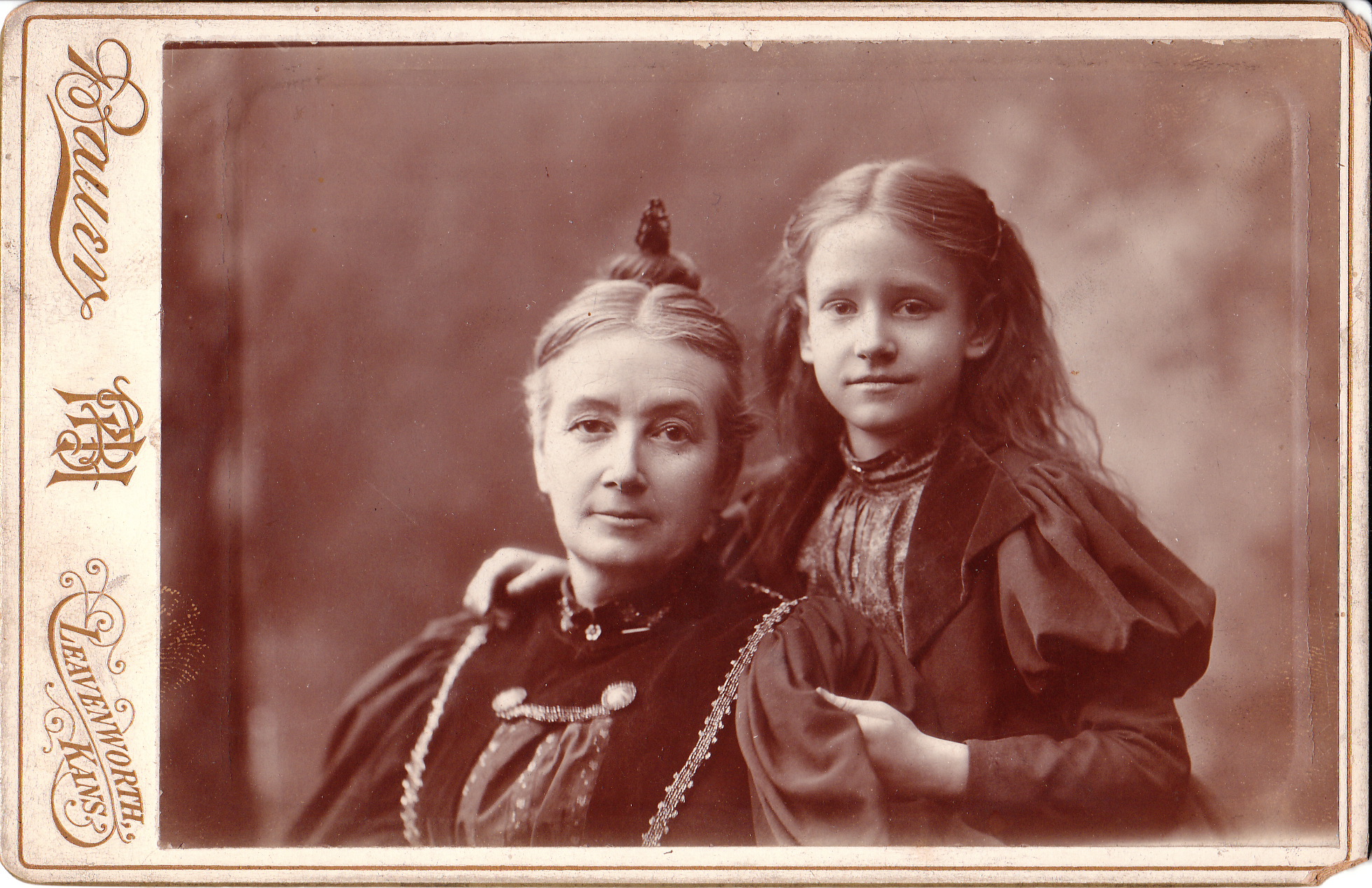 The love between a mother and her daughter is quite evident in this cabinet card portrait by the Bauer studio in Leavenworth, Kansas. Note the intimate quality of this image. The little girl displays a loving look and has her right arm draped over her mother’s right shoulder and has her left hand touching her mothers’ upper arm. The reverse of the cabinet card has printing advertising the address of P. H. Bauer’s studio. The building was located on the northwest corner of Shawnee and Fifth Streets. P. H Bauer’s father, Sebastian Bauer was a pioneer Kansas photographer. He was active in Leavenworth between 1865 and 1887. His son, Pius Henry Bauer (1861-?) started sharing his fathers studio in 1878 and they soon joined as partners. He opened his own gallery in 1887 which he ran past 1900. In 1886 and 1887, a Mary Bauer worked in the gallery. She was reported by one source to be Pius’s sister and by another source to be Pius’s wife.