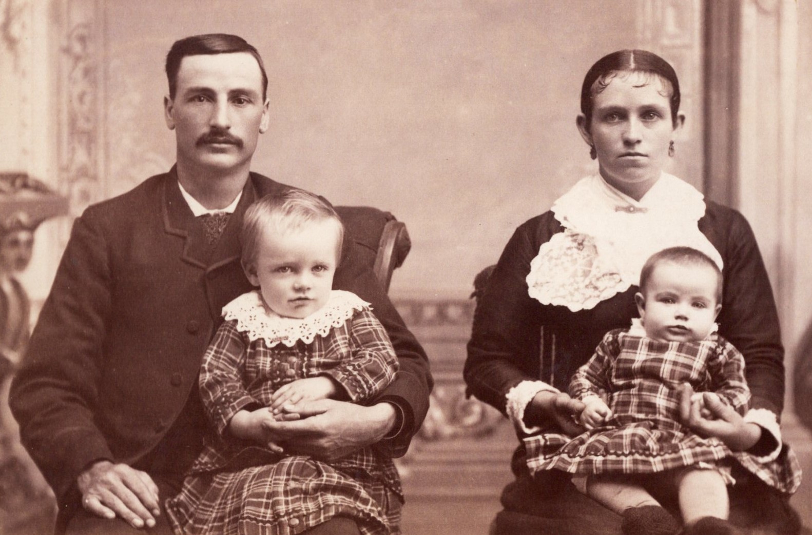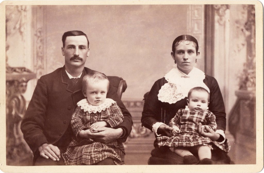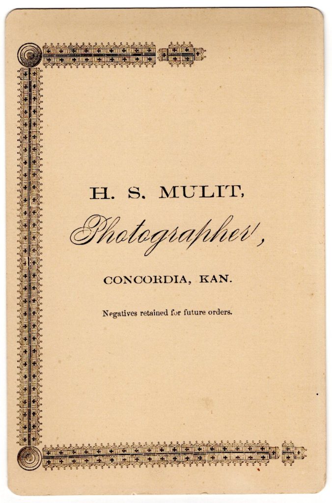 This cabinet card photograph features a mother and father posing for a photographer. Each parent has a young child on their lap. The photographer is H. S. Mulit, whose studio was located in Concordia, Kansas. Little information could be uncovered about Mr. Mulit. The 1885 Kansas State Census reveals that there was a H. S. Mulit (c. 1845- ?) living in Clyde, Kansas. He resided there with his wife and three children. The towns of Clyde and Concordia are only fourteen miles apart, so it is likely that the H. S. Mulit in the census data is the same man who was the photographer of this cabinet card.