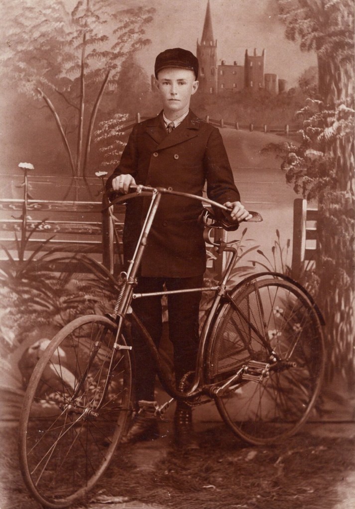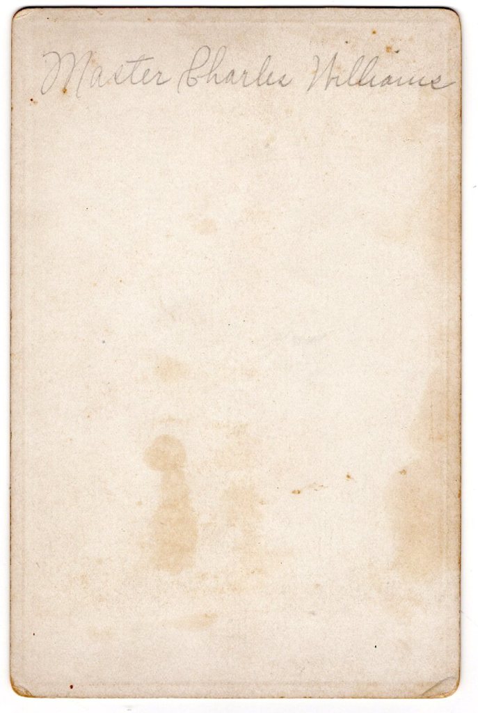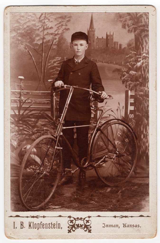 A boy dressed in jacket and tie, poses with his bicycle, in the studio of I. B. Klopfenstein, in Inman, Kansas. Note the castle in the background. The castle is an interesting choice for a backdrop, considering that the studio and the lad are located on the Great Plains of America. The pasty faced boy looks intently at the camera. His bicycle lacks the accessories often seen in images of people posing with bikes in cabinet card photography. This bike lacks a horn, basket, or repair kit. The photographer, Isaac B. Klopfenstein is listed in a number of state and federal censuses. In 1885 he lived in Lincoln, Kansas but by 1895, his residence was reported to be Inman, Kansas. He was of German heritage and was born in 1864, somewhere in Ohio. The reverse of the cabinet card has a pencilled name that identifies the boy in this photograph. The inscription reveals that he is “Master Charlie Williams”. Research efforts to gather further information about the lad were stymied because of the abundance of people in Kansas named “Charlie Williams” during that era. When was this photograph taken? It is safe to say that the image was produced 1889 or later. The town of Inman, Kansas was founded in 1887 but was originally named “Aiken”. The town was renamed in 1889. The new name was Inman, named after nearby Lake Inman. Who is Inman? Inman was the name of the Army Major who originally surveyed the area. (SOLD)