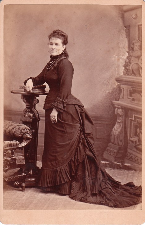 This cabinet card is an image of a middle aged woman posing for her studio portrait. She is wearing a beautiful dress. The woman is probably quite wealthy to be able to afford to dress in such fine fashion. She is also well adorned in jewelry. Note her three strand necklace, her earrings, and her large ring. The photographer of this image is the studio of Edouart & Cobb, located at No. 504 Kearny Street, in San Francisco, California. To view other photographs by these photographers, and to learn some of their background information, click on cabinet card gallery’s category “Photographer: Edouart & Cobb.