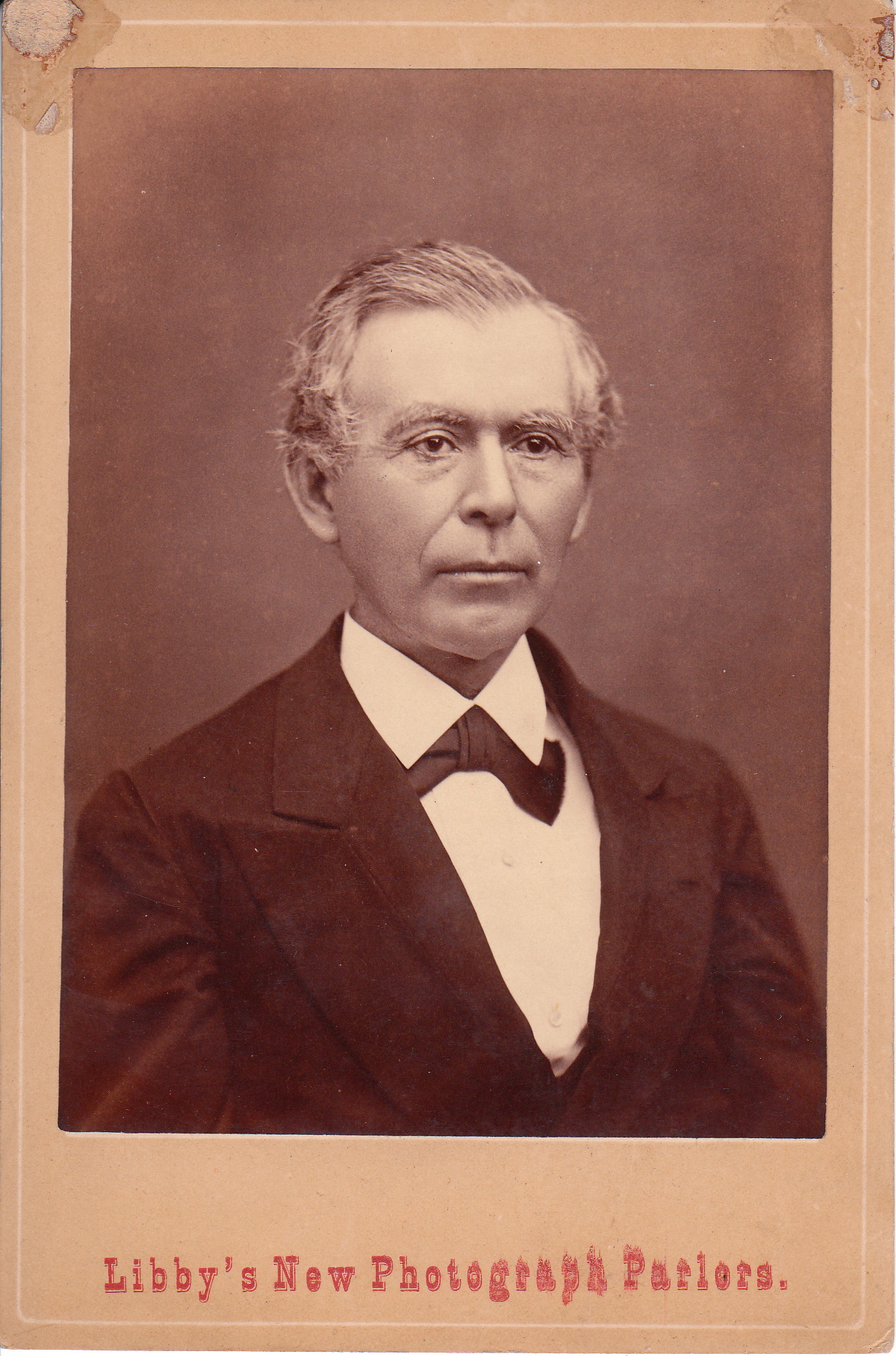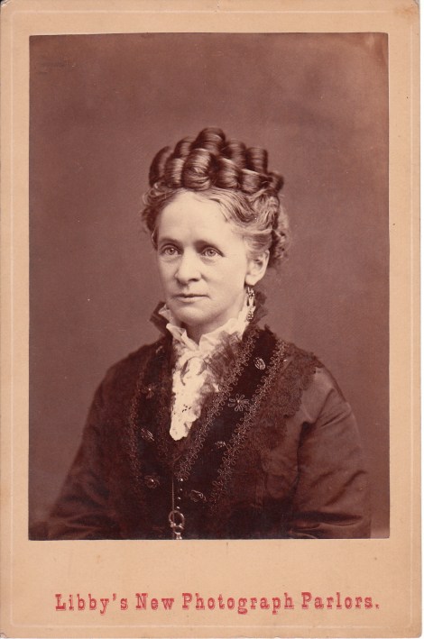 A very handsome couple pose for individual portraits at Libby’s New Photograph Parlors in Keokuk, Iowa. The reverse of the card has a penciled inscription indicating the location was Keokuk, and research confirms that Libby’s was located there. This couple is beautifully dressed and have stylish hairstyles. They have the appearance of prominent citizens of Keokuk. It is also possible that they are important visitors to the town.