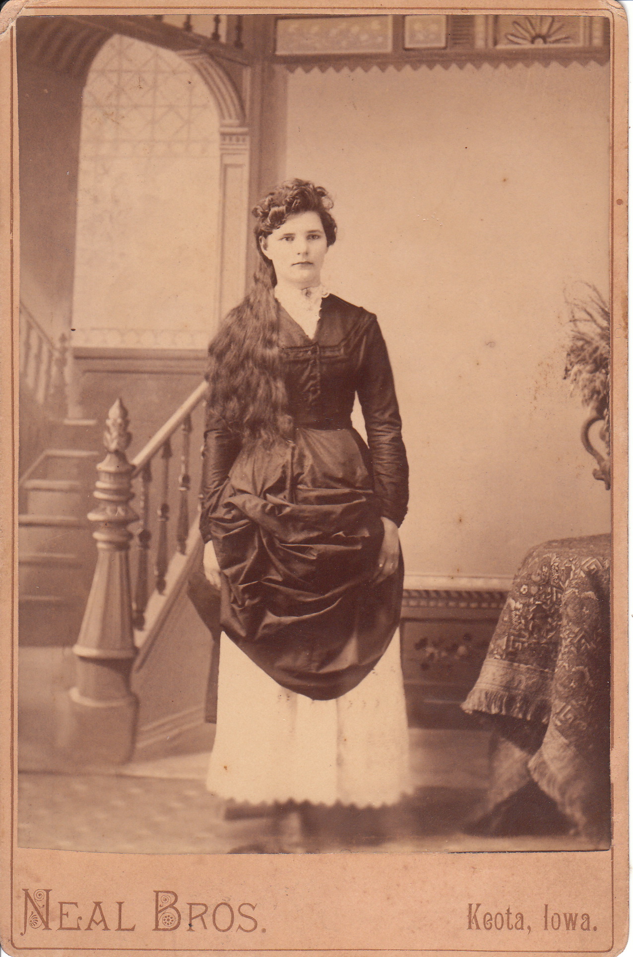 This cabinet card photograph features a pretty young woman with long hair draped over her right shoulder. The image was produced by the Neal Brothers studio in Keota, Iowa. The Milwaukee Journal (1949) has an article about Edwin E. Neal who took over the Keota studio in 1888 and operated it until 1948. It is written that he only used one camera throughout his career. He did change lenses several times as advances were made in the field of photography. Neal’s wife assisted him with photo finishing, posing subjects, and running the business. At some point in his career, according to a different source, Edwin worked in partnership with his brother Charles. To view other photographs by Edwin Neal, click on the category “Photographer: Neal”.