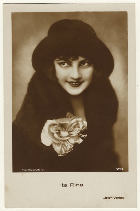 The pretty film actress seen in this vintage real photo postcard (postcard 1) is Ita Rina (1907-1979). Her unusual name is actually a pseudonym. Italina Lida Kravanja was her given name and it’s understandable that she used a shorter and more catchy moniker. Miss Rina was a Slovenian film actress and beauty queen. In the late 1920’s and early 1930’s she was one of the major film stars in Germany and Czechoslovakia. After getting married in 1931 she changed her name to Tamara Dordevic. Rina was a poor student as a child and knew early on that she wanted to be an actress. In 1926 she entered a beauty contest sponsored by a Slovenian magazine and Rina won. She was then slotted to compete in the next level beauty contest but she arrived late and could not participate. No worry though, she was noted by a cinema owner who sent her photograph to German film producer Peter Ostermayer who invited her to Berlin for an audition. In 1927, Rina went to Berlin without her mother’s permission. She took classes in acting and dancing. She made her debut in the film “What Do Children Hide from Their Parents” (1927). After a number of small film roles, she received some attention for her role in the film “Last Supper” (1928). Her breakthrough occurred in the film “Erotikon (Seduction)” (1929) in which she had a starring role. The film was a great success but upset some moral and Christian organizations for it’s eroticism. Some consider her best role to have been in the Czech sound film “Tonka Sibenice” (1930). Rina received an offer from Hollywood but her husband vetoed it and she decided to stay with her husband. However, she continued her film career until the beginning of World War II. Rina’s IMDB filmography asserts that she appeared in 19 films.