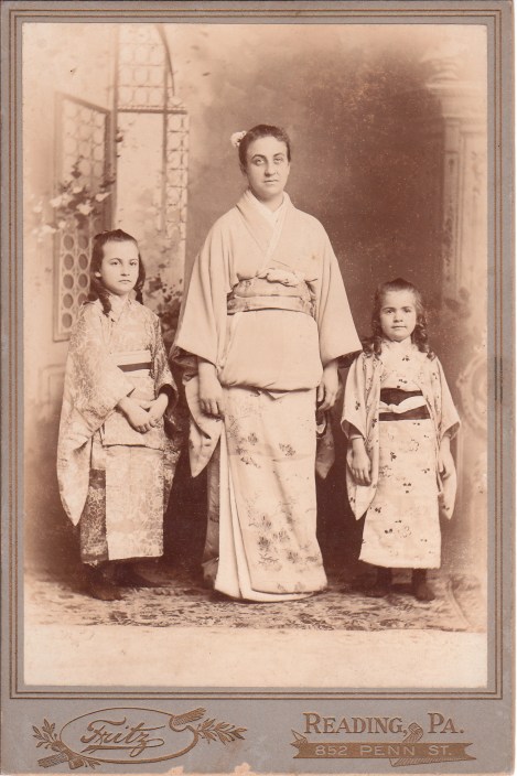This vintage photograph features a pretty Japanese woman wearing a kimono. I am curious about why her hair is styled in such a perfectly coiffed straight up fashion. My guess is that the hair style’s purpose is to show the woman’s complete facial beauty. Just a guess on my part. The previous owner of this photograph identified the year it was taken as 1915. It is likely that this date is printed (in Japanese) on the front of the photograph. At the very least, this image is from circa 1915. The photo was taken by Tanaka who operated a studio in Tokyo, Japan. This antique photograph measures about 6 3/4″ x 3 1/2″ and is in very good condition (see scans). Residue on the reverse of the photograph indicates that it once resided in a photo album.