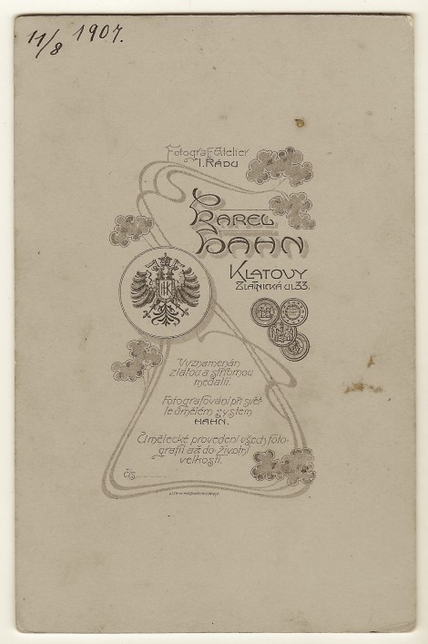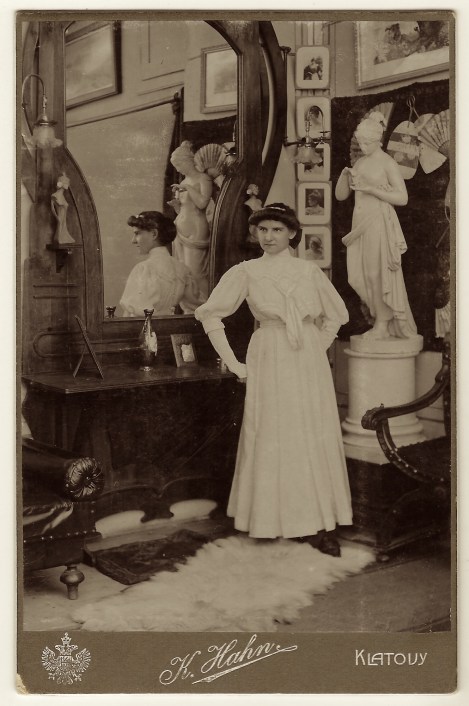 This cabinet card photograph is unusual in that it offers us a view of a room inside of a turn-of-the-century photographer’s studio. The young woman is awkwardly posed and a bit far from the camera but the focus of this image is more about the room rather than it’s occupant. The room is quite cluttered with interesting objects. Note the large statue and statuettes. Hanging from the wall, are a number of fans. Also on the wall are paintings and at least five close-up photographs of attractive women. Hanging next to the large mirror, are two identical interesting lamps. Covering the floor is an animal skin rug as well as a Persian rug. Be sure to take a close look at the furniture. The furniture is nice looking but very bulky. The photographer of this photograph is Karel Hahn who was active in Klatovy, Czechoslovakia, from 1893 until 1943. An inscription on the reverse of the cabinet card indicates that the photograph was taken in 1907.   SOLD