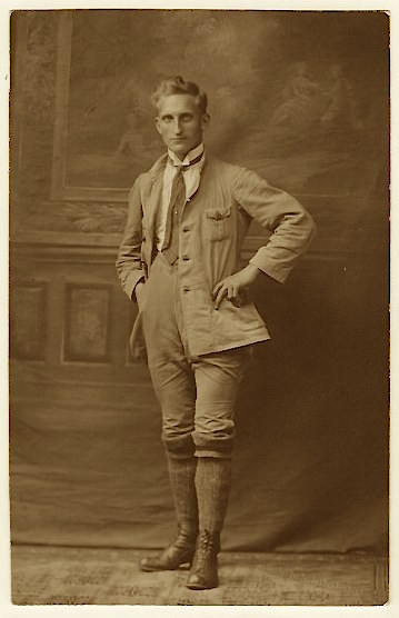This vintage real photo postcard features a gentleman making a fashion statement. Note those knickers. This man is wearing fancy clothing but he is definitely sporting a casual, disheveled look. He is wearing a winged high collar dress shirt. A tie tac holds his necktie in place. This portrait postcard is of European origin and is in excellent condition.