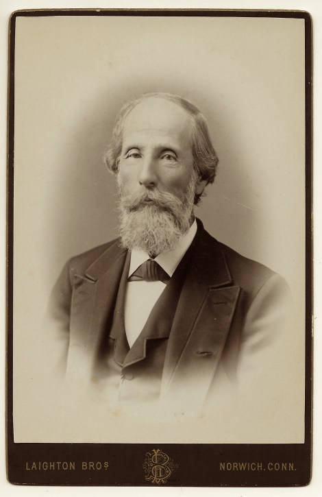 This cabinet card portrait features a well dressed older man with a long mustache and wiry beard. He has the expression of a person who has seen and experienced a lot in his many years. He looks a bit drawn and tired. The gentleman was photographed by Laighton Brothers studio in Norwich, Connecticut. The Laighton Brothers are cited in the book, “Leading Business Men of Norwich and Vicinity” (1890). At the time of the directory’s publication, William S. Laighton had become sole proprietor of the studio upon the death of his brother John. William was a native of Farmington, New Hampshire. William’s obituary appears in the Bulletin of Photography (1915). The brief article reports that he had died as a result of a fall in his studio. At the time of his death he was 76 years old. The article also mentions that he had been living in Norwich since 1874.