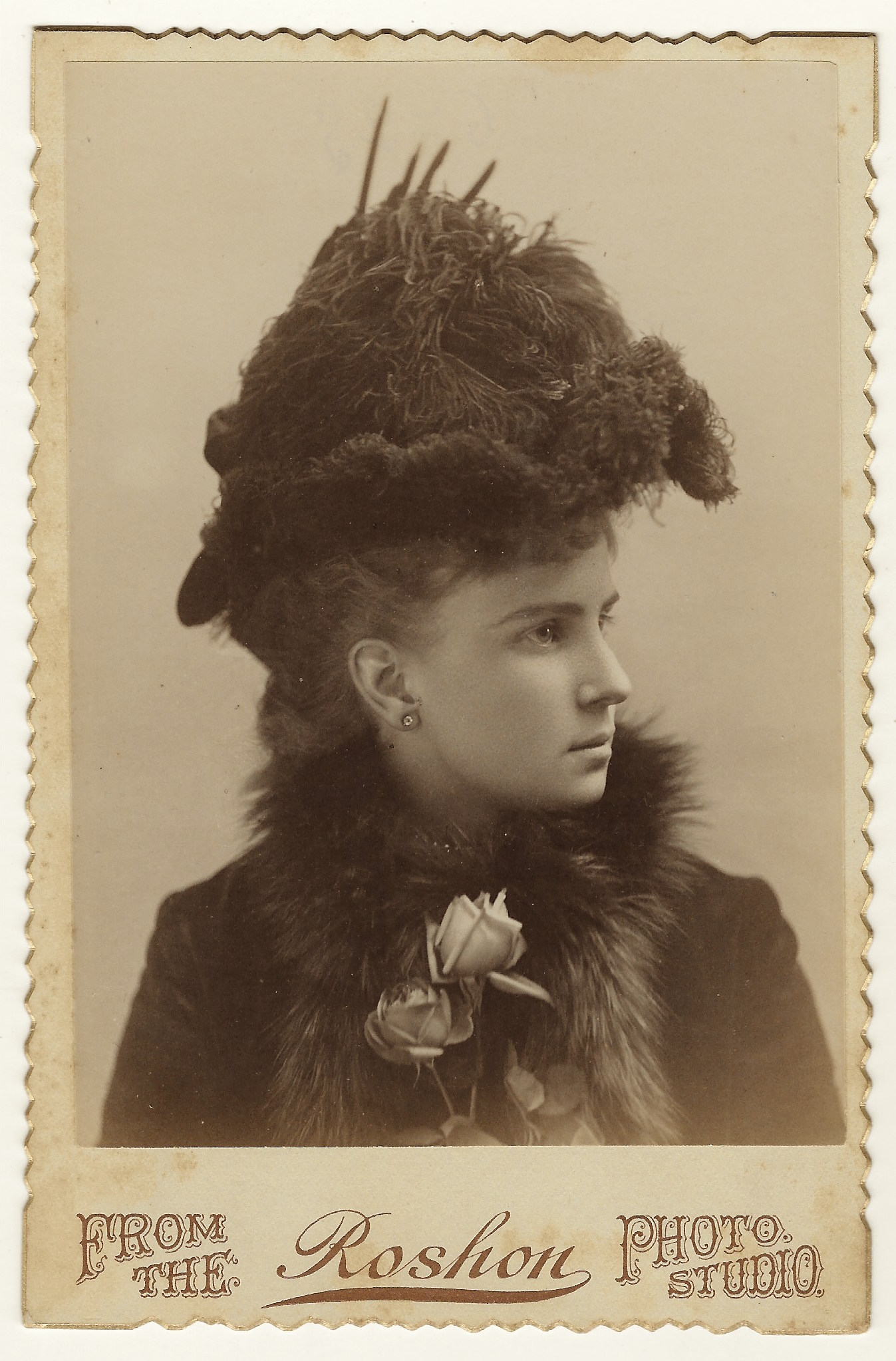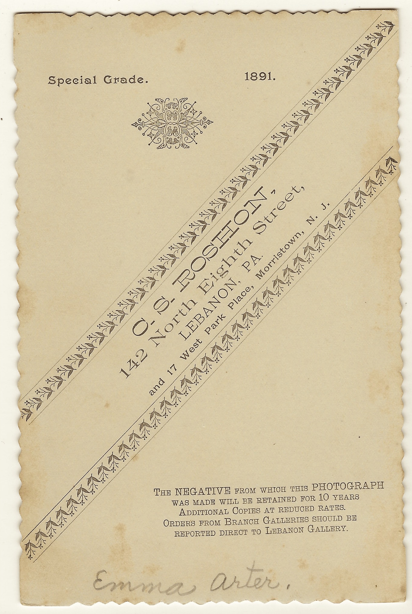 This cabinet card features a very beautiful and fashionably dressed young woman. Her name, Emma Arter, is listed on the reverse of the cabinet card. Miss Arter is wearing a stylish hat and a pretty fur collar. She appears very self assured. When I first saw this photograph, I was convinced that Miss Arter was a theater actress. Preliminary research found no information about an actress with that name. More general research could not locate any confirmed biographical information about this lovely young lady. This cabinet card is from the studio of C. S. Roshon of Lebanon, Pennsylvania. According to printing on the reverse of the photograph, the image was produced in 1891. The Roshon Galleries were located at 142 North 8th Street, and 22 South 9th street, in Lebanon. Roshon also had a studio in Harrisburg and another gallery in Morristown, New Jersey. To view other photographs from Roshon’s studio, click on the category “Photographer: Roshon”. SOLD