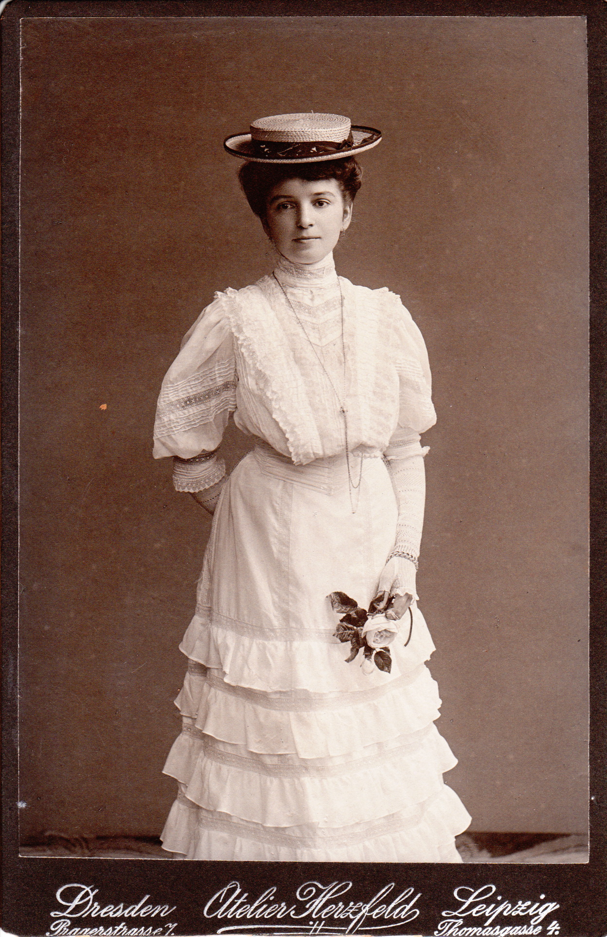 A pretty German woman is the subject of this photograph by Martin Herzfeld. The photographer operated studios in Dresden and Leipzig, Germany. The well dressed woman is wearing a long white dress, fingerless gloves, and a straw hat that appears to be floating atop her head. She is clutching a rose and adorned with jewelry, including a necklace and earrings.