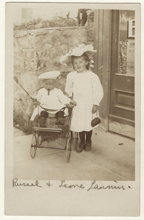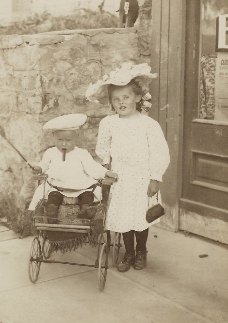This vintage real photo postcard captures two siblings posing for their portrait. They are standing in front of a doorway of what appears to be a business. There is a “closed” sign on the door’s window. The older sibling is a little girl wearing a flower topped hat and holding a dainty purse. The younger sibling is sitting in a stroller of some sort and appears to have a cigar in his/her mouth. The baby is holding some sort of stick and is strapped into the stroller. There are some hints to the identity of these children. Below the image are the names “Russel and Leone Lannier”. On the reverse of the postcard is the name “Clayton Allen”. This evidence was not enough to facilitate a successful identification of these children. The stampbox on this postcard shows the logo “Kruxo” which indicates that it was produced sometime between 1908 and the 1920’s. Kruxo photo paper was made by Kilborn. SOLD