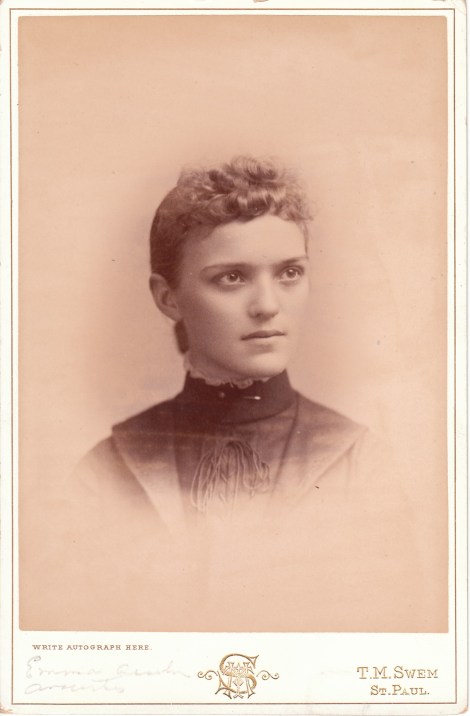 Emma sits for her portrait at the studio of T.M. Swem of St. Paul, Minnesota. Research from the Minnesota Historical Society reveals that the photographer is Thomas M. Swem who was born in Lima, Ohio in 1848 and began his photography business in Missouri in 1882. He moved to St. Paul, Minnesota and operated photography studios from various locations there from 1883 through 1899 when he moved out of state. Further research finds that he continued his photography business after leaving Minnesota. To view other photographs by Swem, click on the category “Photographer: Swem”.