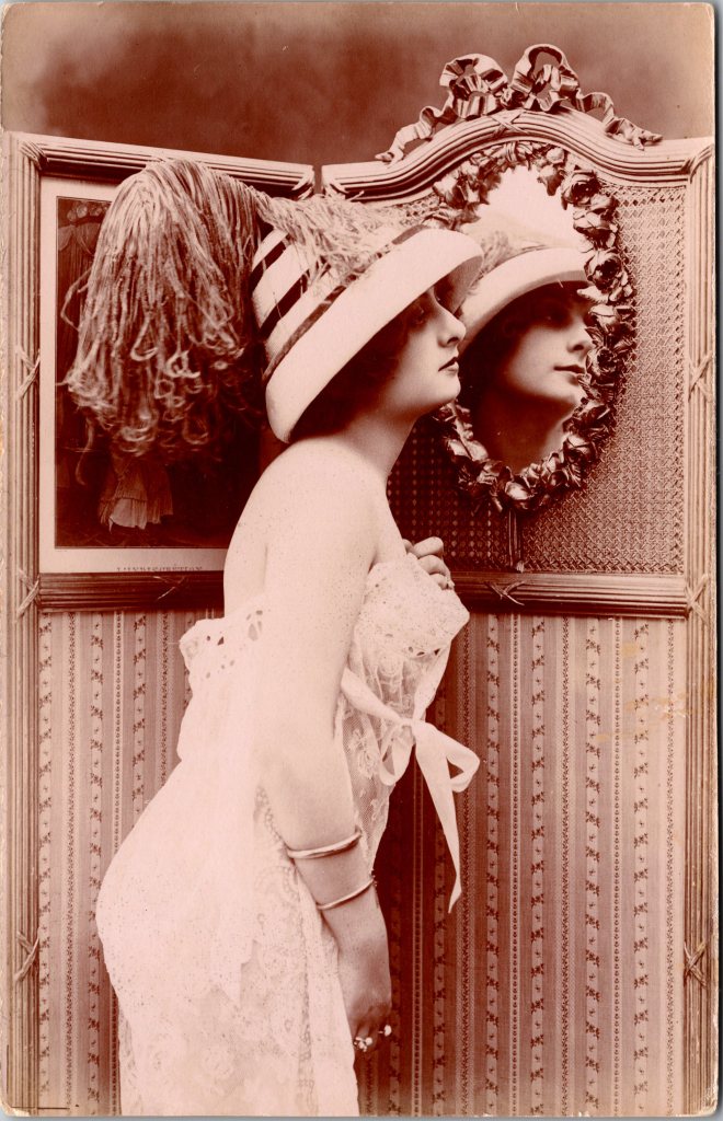 This vintage real photo postcard features a pretty young scantily clad woman, getting dressed. She is dressed in her lingerie and the rest of her clothes are on the chair beside her. Interestingly, it appears that there is a wig on the dressing table at her right. This young lady has a fetching smile. The card is part of a series (No.4287). SOLD