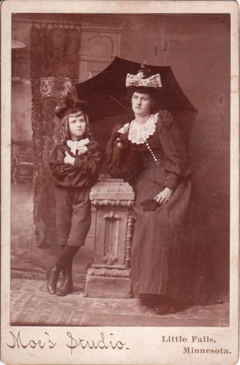 A young woman and an even younger boy pose for their portrait at Moe’s Studio in Little Falls, Minnesota. One can only guess about their relationship. Are they mother and son? Could they be brother and sister? The answer to these questions will likely remain unknown. The woman under the umbrella appears pensive. She is wearing a hat and holding gloves. The boy is dressed in the popular “Little Lord Fauntleroy” style that was in fashion at the time of the photograph. No information could be found about Moe or Moe’s Studio. The last name “Moe” appears to have been a popular name in Little Falls around the turn of the century. The name was of Norwegian origin.