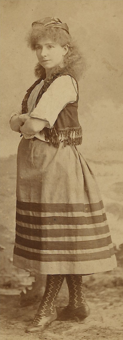 This cabinet card image is a portrait of vaudeville and musical theater entertainer, Miss Lizzie Evans (c1864- 19? ). She is known for her performances in New York City and Chicago from the 1880’s through the early 1900’s. The New York Times once described her performing skills as similar to celebrated actress, Lotta Crabtree. The website “Broadway Photographs” states that she was “small, flat-chested, and intelligent looking rather than beautiful, she captured attention by her cleverness on stage and her unflagging energy”. Her nickname was “The Little Electric Battery”. Evans was born in Mount Vernon, Ohio. She made her stage debut in 1882, as a 17 year-old. She joined the Nobles theater company where she performed a role in “The Phoenix”. After leaving the Nobles company she joined C. E. Callahan where she starred in plays for nine years. Her roles included parts in “Fogg’s Ferry” and “The Buckeye”. A New York Times (1881) review of her appearance in “Foggs Ferry” reports that her performance was “earnest and vivacious”. The reviewer also stated that “Miss Evans has no voice for song” but that her talent as an actress should allow her the luxury of avoiding any “vocal efforts”. After leaving her association with Callahan’s company, Evans retired for two years. Apparently she had trouble staying away from the theater lights, which was evidenced by her appearance in “Old Kentucky”. She than performed in vaudeville until the 1900-1901 season. Following her vaudeville appearances she formed her own troupe. Her biography indicates that the lure that took her away from musical theater was that vaudeville offered both top billing and big money. She was married to the famous comedian, Harry Mills in 1891. This portrait of Miss Evans was taken in 1885, according to the inscription in the reverse of the photograph. The photographer was D. H.Anderson who operated a studio on Broadway in New York City. Anderson used the same photo studio formerly occupied by the famed photographer, Matthew Brady. Anderson had worked in various other American cities before moving to New York in 1881. He became known as a talented celebrity photographer. This cabinet card is in good condition (see scans). (SOLD)