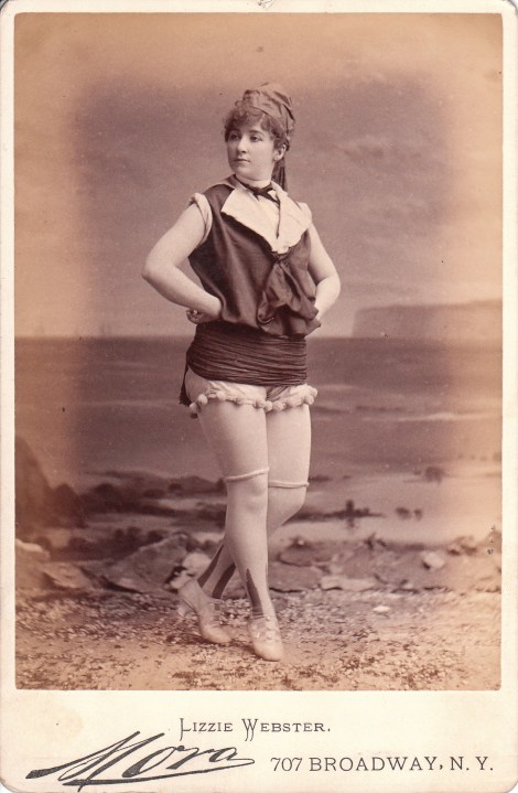 The top cabinet card features theatre actress Lizzie Webster posing at the beach. OK; its not the beach, but it is a fake beach, at the studio of celebrity photographer, Mora, in New York City, New York. Webster appeared on the American stage in the late 1870’s and early 1880’s. She appeared on tour in Edward Rice’s popular show, “Evangeline”. The Brooklyn Daily Eagle (1878) described Miss Webster as a “shapely brunette”, and a “beautiful being”. However, the article states that she did not possess a good voice. In 1893, Lizzie Webster died in Milwaukee, Wisconsin. To see other photographs by Mora, click on Cabinet Card Gallery’s category “Photographer: Mora”.