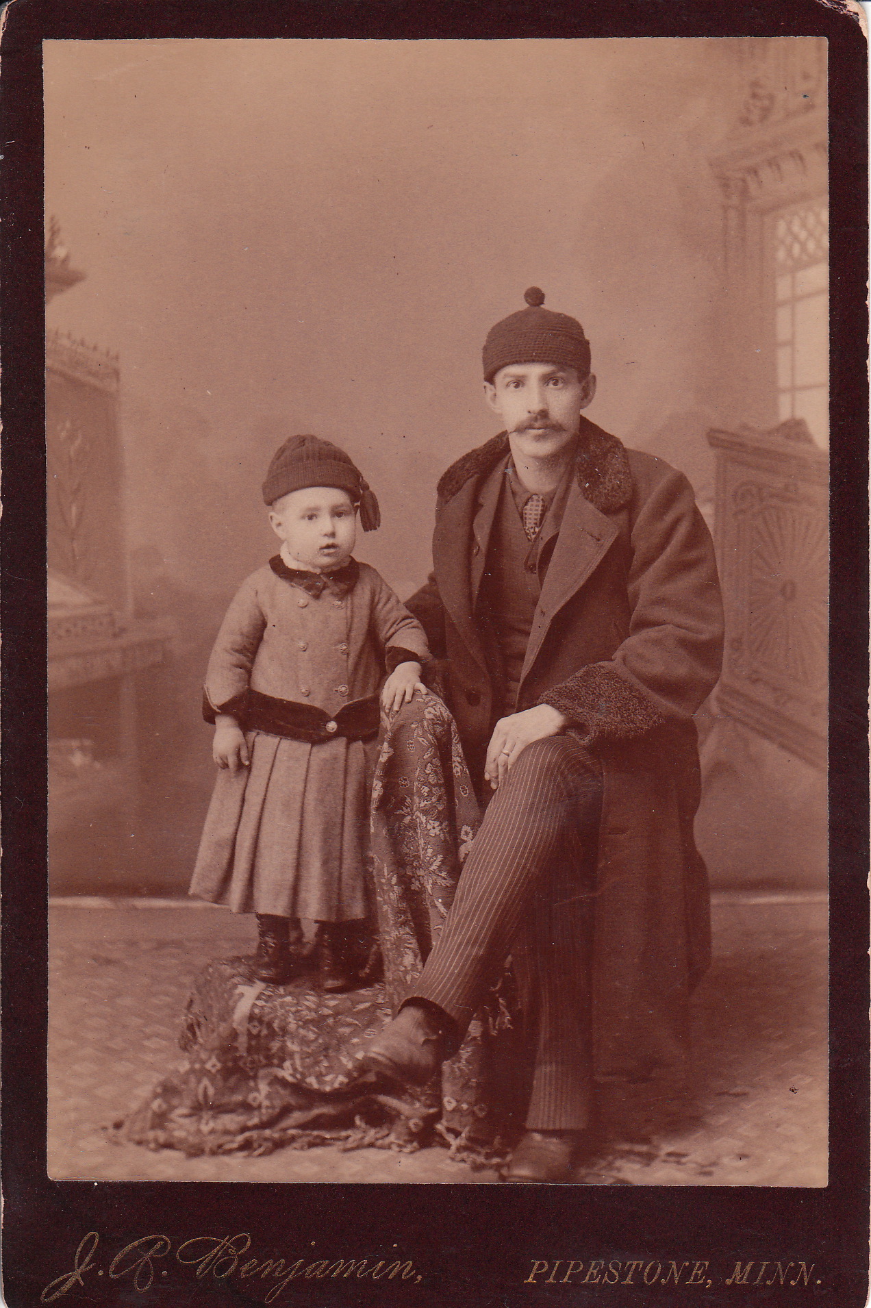 A father and his child pose in their winter clothing for photographer J. P. Benjamin in Pipestone, Minnesota. Both are wearing outer coats and snow hats. No biographical information could be found concerning the photographer of this cabinet card other than he was active in Minnesota in the 1880’s. Pipestone is located in southwest Minnesota. Henry Wadsworth Longfellow mentioned the beautiful stone area around Pipestone in one of his poems (Hiawatha). The town was established by two settlers who wanted to visit the site mentioned in the poem. A pipestone quarry is located about a mile north of the town and it was named a National Monument in 1937. This cabinet card has a very slight bow and is in very good condition (see scans).