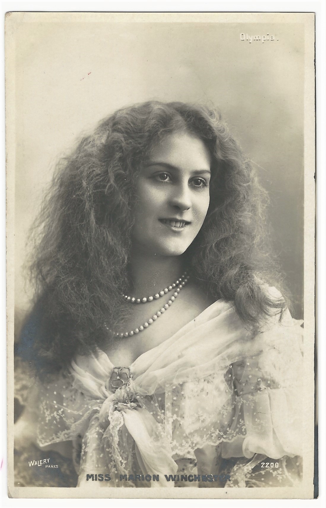 Marion Winchester (1882- ?) is the subject of this real photo postcard portrait. She was born in California. She began her professional career in 1899. She was trained at the Alviene Stage Dancing and Vaudeville School of Acting, at the Grand Opera House in New York. Winchester’s London premiere occurred in 1903 when she performed at the Oxford Music Hall where she was billed as the “World’s Champion Cake Walker”. She left London to appear in Paris where she received accolades for her dancing ability. In 1921, she applied for an emergency passport at the American Embassy in Paris. Her paperwork indicated that she resided in Paris where she studied music. She later married Italian pianist and composer, Count Aldo Solito de Solis (1905-1973). The pair divorced in 1940 and De Solis then married actress Gale Page. A photograph of Miss Winchester can be found in England’s National Portrait Gallery. Marion Winchester has appeared on Broadway four times between 1900 and 1902 and once again in 1934. She was mainly active within her career between 1899 and 1908. She was known for being a specialty dancer. An article in “London Week by Week” (1904) tells an interesting anecdote about Winchester. The article refers to the actress as the “Sugar Queen” and explains the origin of this nickname. It is reported that one day she was in the corridor of a fancy hotel and she was sucking on a piece of candy. She happened on the path of the “Emperor of the Sahara”, Jacques Lebaudy. The eccentric sugar magnate said to her, “Give up sugar-stick, and buy sugar stock”. It is said that she took the tip, and made a great deal of money, keeping her well stocked with furs, beautiful dresses, and diamonds. This portrait postcard was photographed by Lucien Walery. He was a celebrated Paris photographer known for his portraits of artists and cabaret dancers from the city’s music halls. He is very well known for his portraits of Mata Hari and Josephine Baker. Walery did a lot of work in the genre of nude/erotic photography. He photographed the beautiful women of Paris between the early 1900’s and the 1920’s. Walery does an excellent job of capturing Miss Winchester’s loveliness. Note her beautiful long hair. This postcard is part of a series (no. 2200). (SOLD)