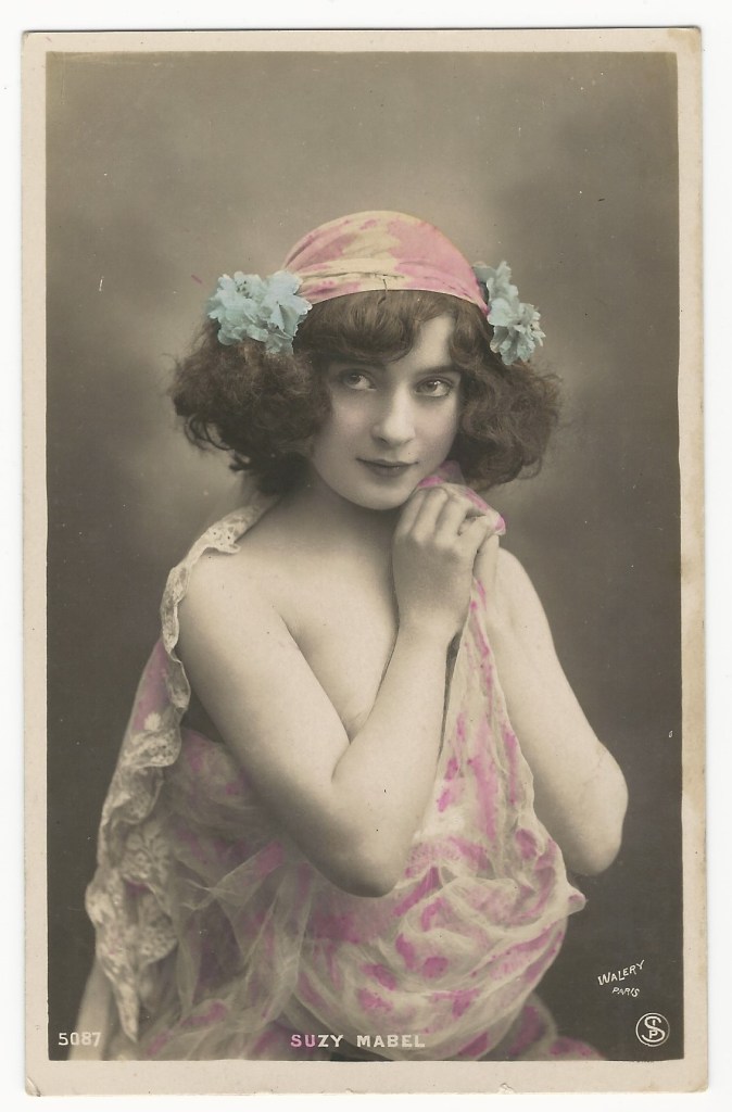 The subject of this vintage real photo postcard is theatre actress, Suzy Mabel. I was unable to find much biographical information about this pretty young woman with an enticing smile. The magazine, “Navy and Army” (1905) published a full page spread of Miss Mabel. The article included four photographs of Miss Mabel. One of those photographs was identical to the photo above. A caption beneath the images reads “One of the most popular of the young actresses now appearing at La Scala, Paris”. Le Concert de La Scala was built in 1873 and was one of the most famous cafe-concert halls of the Belle Epoque. The portrait of Suzy Mabel seen on this postcard was photographed by Lucien Walery. He was a celebrated Paris photographer known for his portraits of artists and cabaret dancers from the city’s music halls. He is noted for his portraits of Mata Hari and Josephine Baker. Walery did a lot of work in the genre of nude/erotic photography. He photographed the beautiful women of Paris between the early 1900’s and the 1920’s. This postcard was postmarked in 1907. The card was published by Societe Industrielle de Photograpie (SIP) of Rueil, France, as part of a series (no. 5087). SOLD
