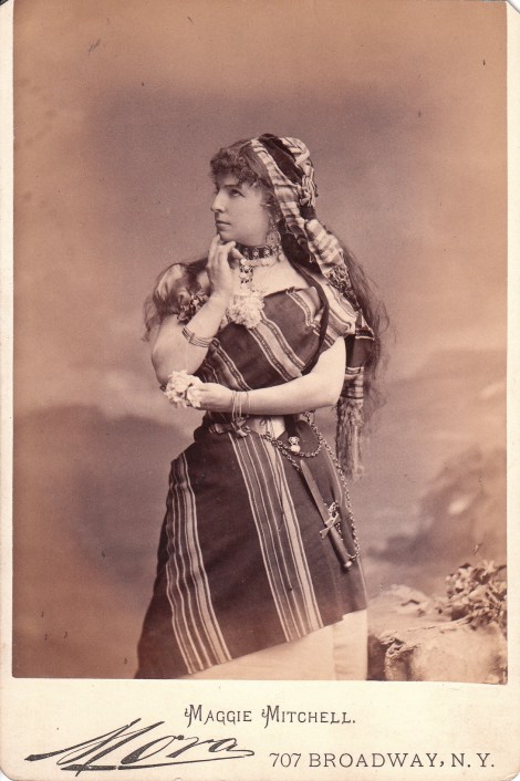 Maggie Mitchell (1832-1918) was a famous American actress, born in New York. Her first regular stage appearance was in “The Soldier’s Daughter” at the Chambers Street Theatre in 1851. Her first major success was as star of “Oliver Twist”. She has been described as small, agile and energetic, with a special talent for comedy. In 1860, she appeared in “Fanchon, The Cricket” which was adapted for her from a George Sand novel. She performed in this and other plays in front of President Abraham Lincoln. The photographer of the top image was celebrity photographer, Mora, of New York City. To view other photographs by Mora, click on Cabinet Card Gallery’s category, “Photographer: Mora”. The second portrait of Miss Mitchell was taken by the esteemed Philadelphia photographic studio, Gilbert & Bacon. This cabinet card image shows Maggie displaying a “come hither” expression. To view more photographs by this studio, click on the category “Photographer: Gilbert & Bacon”. ADDENDUM: A knowledgeable visitor to Cabinet Card pointed out that the second photo of Miss Mitchell is actually actress Lotta Crabtree (see comment below). A bit of research confirmed his astute observation. Lotta Crabtree, a woman who led a very interesting life, will receive her own entry in the cabinet card gallery in the next few days.