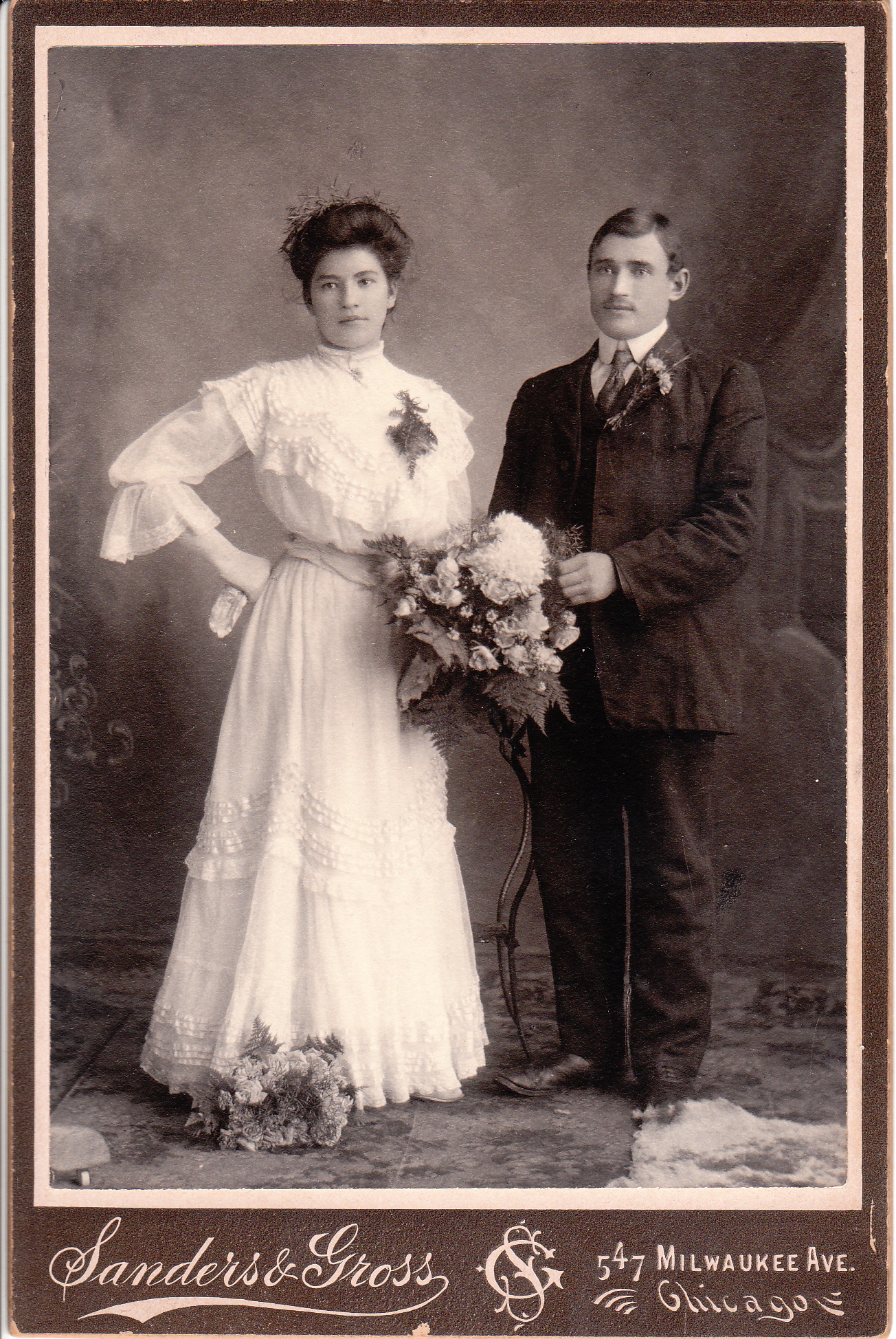 This wedding party photograph features a bride, a groom, a maid of honor, and a best man. There is of course a possibility that the four subjects are actually participating in a double wedding. Both women in this photograph are pretty and dressed in flapper attire. This indicates that the photograph was taken in the late 1910’s or the 1920’s. Each of the women has a bouquet of flowers and the men are both wearing boutonnieres. An interesting side note is that the seated man is resting his hand just above the seated woman’s knee. This an unusual sight in a photograph from this era. This is a folder style photograph. SOLD
