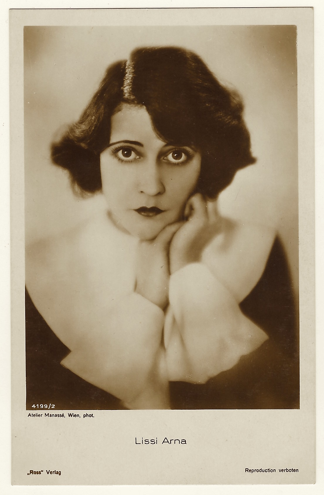 These vintage real photo postcards feature German actress Lissi Arna (1900-1964). She is known for the films “Harbor Drift” (1929, The Squeeker (1931), and Under the Lantern (1928). She appeared in German silent films and entered US films in 1930. She was an exotic femme fatale in German silents She was married to a doctor in 1939 and the couple lived in Venezuela until his death. She appeared in Hollywood in German language versions of American films. She was in the US for only one year and failed to get significant offers from any of the major studios. In the sound era she gradually lost her popularity and was confined to supporting roles through the 1930’s. The IMDb credits her with 62 films between 1915 and 1962. View the YouTube video below to see Lissi Arne appearing in “Under the Lantern” (1928).The first postcard was published by Ross Verlag as part of a series (no. 4199/2). Miss Arna’s portrait was taken by the Manasse studio which was located in Vienna, Austria. There also was a branch of the studio in Berlin. The Manasse studio was in existence between about 1922 and 1938. The studio was run by Olga Solarics (1896-1969) and her husband Adorja’n von Wlassics (1893-1946). Olga was known for her interest in photographing nudes. The studio flourished in Vienna during the 1930’s. Many of the portraits taken by the studio had an erotic flavor. The studio attracted some of the leading ladies of film and theater. The studio was also involved in producing photographs for advertising. This husband and wife team of photographers were very talented and very successful in their profession.