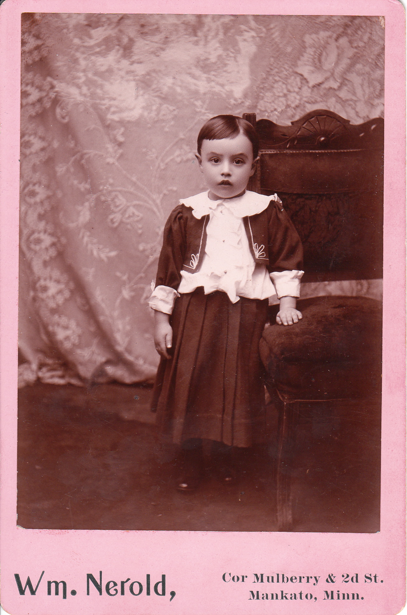 Elmer poses for his portrait at the studio of William Nerold in Mankato, Minnesota. Nerold was a photographer in Minnesota during the 1890’s and according to the Minnesota Historical Society, he had a studio in Mankato in 1895. This cabinet card effectively presents an image of young Elmer that captures his remarkable facial features.
