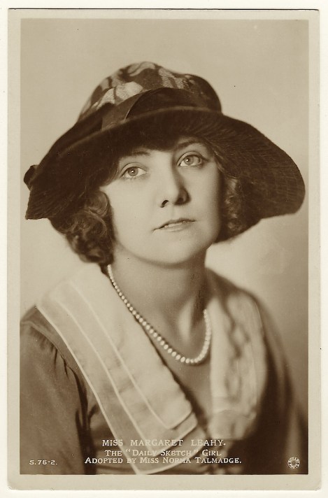 Margaret Leahy (1902-1967) was a British actress. She was born in London. At the age of eighteen, she set up a costume shop and designed women’s clothing. She also modeled her designs for her customers. The story of how she got her start in acting is an interesting one. After winning a beauty contest, she seemed destined for stardom. Unfortunately, despite her rapid launch into filmdom, her career quickly crashed. She made only one film in her short-lived career. The beauty competition occurred in 1922. Actresses, Constance and Norma Talmadge, Joseph Schenck (film studio executive), and Edward Jose (film director) held a beauty contest in England. It’s purpose was to find a new leading lady. The “Daily Sketch”, an English newspaper, offered a starring role in a major Hollywood film to the winner of the contest. Eighty thousand women entered the contest and three girls were chosen to the final competition. The finals were held in Hollywood and Miss Leahy was the winner. Norma Talmadge described Leahy as “the most ravishing girl in England”. Leahy’s start in films was a disaster. She was dismissed from “Within the Law” (1923). The film’s director found her acting talent was nearly non-existent. He threatened to quit unless Leahy was terminated. The year 1923 wasn’t all bad for Miss Leahy. She was named one of thirteen WAMPAS Baby Stars. Evelyn Brent, Eleanor Boardman, and Laura La Plante were among the thirteen. All but Leahy became successful film actresses. Between 1922 and 1934, WAMPAS association supported a promotional campaign that named thirteen young actresses thought to be destined to become stars. Margaret’s next stop was an appearance in a Buster Keaton comedy, “Three Ages” (1923). Leahy received little attention for her role in the movie and her career was stopped in it’s tracks. Leahy did not return to England. Instead she got married and remained in California. She became an interior decorator and was known to despise the movie industry. In fact, she burned all her movie related scrap books. Sadly, Leahy committed suicide at the age of sixty-four in California. This vintage postcard was published by Rotary Photo and printed in England. The postcard is part of a series (no. 5.76.2). The postcard is in very good condition (see scans). SOLD