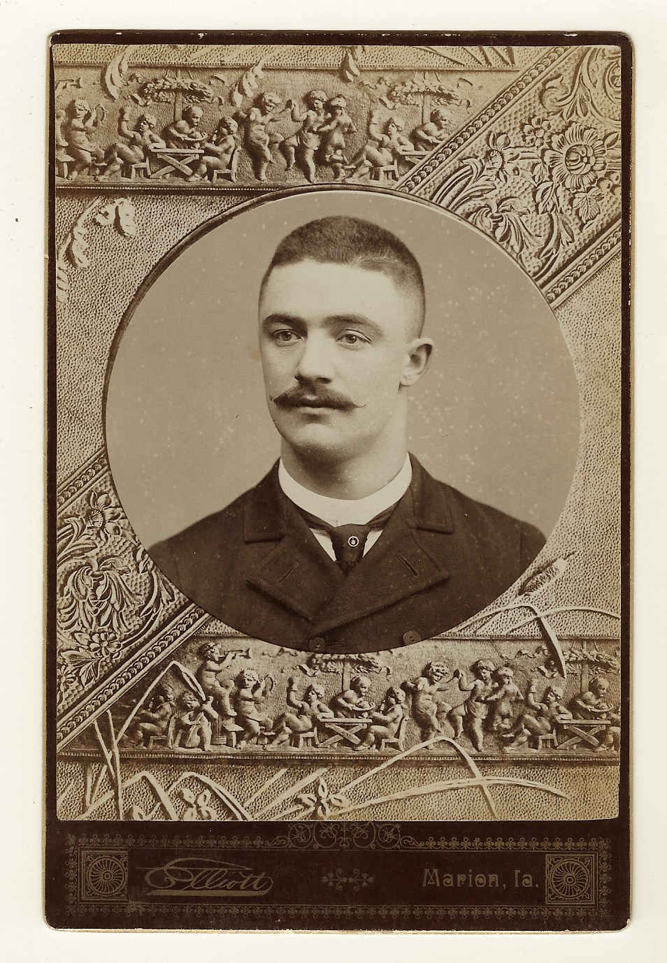 This cabinet card is a memorial card produced by the Elliott studio in Marion, Iowa. The young man in this photograph had passed away and this image served as a remembrance for his family and friends. To view other photographs by this photographer, click on the category “Photographer: Elliott”.