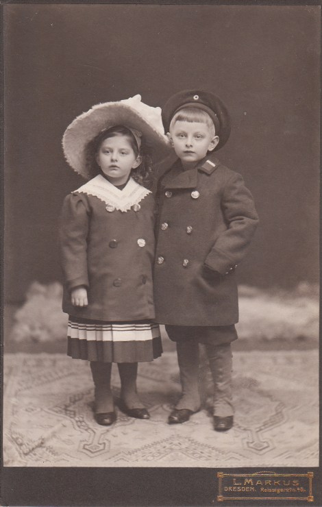 This image presents two adorable and extremely well dressed children posing for their portrait at the studio of L. Markus, in Dresden, Germany. They are dressed in the finest fashion for cool weather. Their mother appears to have had a great sense for what was fashionable in children’s clothing. The young lad’s outfit shows a nautical influence.