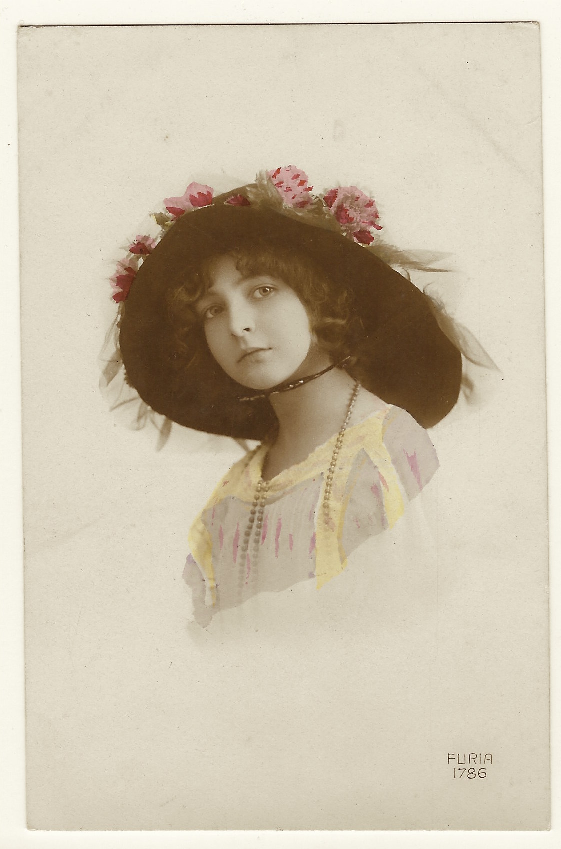 This vintage real photo postcard features a pretty teenage girl wearing a large hat topped with flowers The postcard is color tinted and published by Furia as part of a series (no. 1786). Furia was a French postcard company. Most of the Furia cards that I have encountered have been greeting postcards. Pure artistic Furia cards, such as the one above, are much harder to find. The message on the reverse of this postcard indicates that it was written in Marseille, France in 1917. (SOLD)