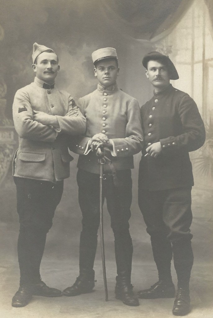 This cabinet card portrait features three uniformed military men posing for their portrait at the Tully studio in Marseille, France. The soldier in the middle is holding a sword. The soldier on the right has a cigarette in his left hand. Each of the three men are wearing different style uniforms. I wonder if the men are in different branches of the military? These soldiers look squeaky clean. They certainly didn’t go directly from the trenches to the photo studio. The photographer, Marc Tully, did a fantastic job photographing these soldiers. The men are beautifully posed. SOLD