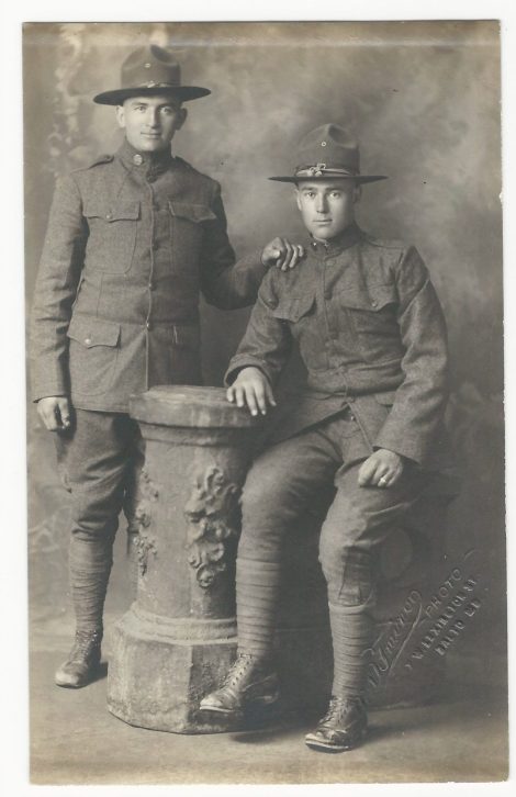 This vintage real photo postcard features two handsome uniformed World War I era soldiers posing for their portrait at a studio in Baltimore, Maryland. The photograph was taken by Martin D Trainor. His name is embossed near the bottom right hand corner of the image. The Maryland Historical Society has one or more of his photographs in their collection. The AZO stamp box indicates that the postcard was published between 1918-1930. (SOLD)