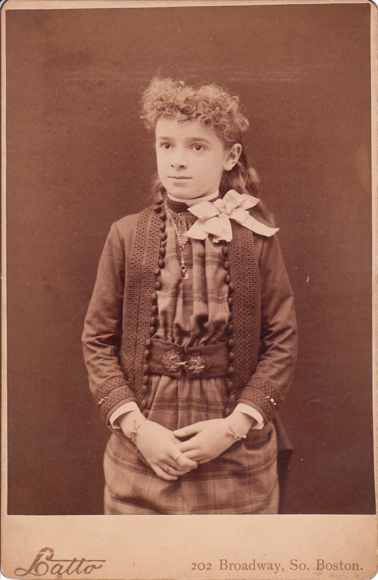 A cute girl poses for her portrait at the studio of Latto, of Boston, Massachusetts. The youth is wearing a lot of jewelry; including a necklace, bracelets, and rings. She is also wearing a ribbon as well as an interesting belt and button sweater. She has moderately long hair and it is quite curly. The photographer, John C. Latto is listed as a photographer in the 1873 Boston Directory. At that time, he was partnered with George T. Rand. A publication of the South Boston Citizen’s Association(1900) mentions the “recent” death of Latto and the sale of his business to photographer, Lester Ayer. The publication also cites Latto as one of the leading photographers of Boston.