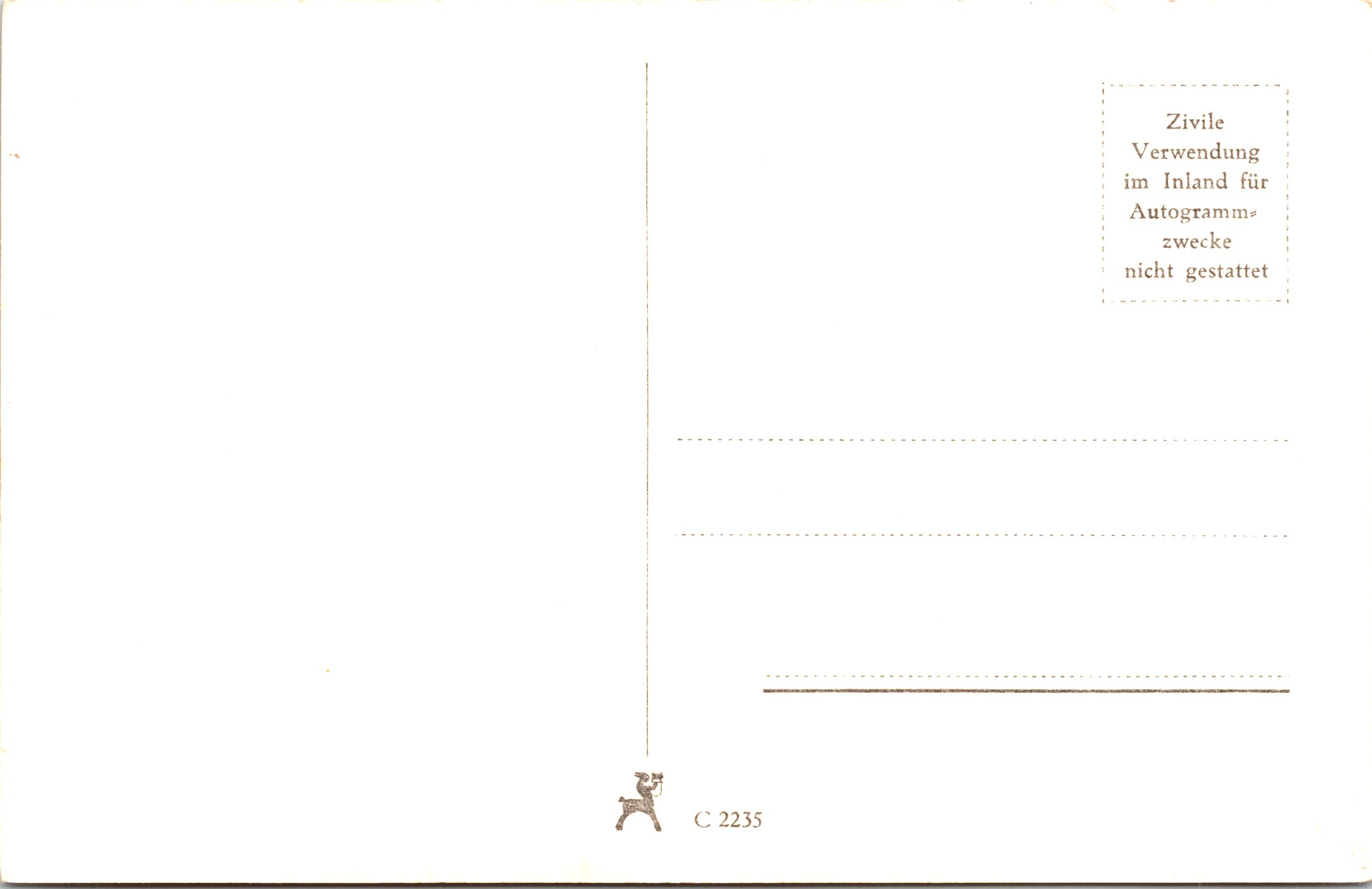 This striking vintage real photo postcard features a glamorous close-up portrait of Ilse Werner, a celebrated German-Dutch actress and singer known for her charismatic screen presence and unique whistling talent. In this image, Werner is draped in a shimmering veil that frames her face with a soft, radiant glow. Her expressive eyes, long lashes, and glossed lips project a poised, serene beauty, while the glinting fabric around her adds a mystical, almost cinematic aura. The postcard was published by Film-Foto-Verlag, a major distributor of German film star postcards during the 1930s and 1940s, and is marked “A 3732/1” in the lower left corner. The photo credit goes to Foto Quick. .On the reverse is the wartime disclaimer: “Zivile Verwendung im Inland für Autogrammzwecke nicht gestattet” (Civilian use for autograph purposes not permitted), reflecting its origin in Nazi Germany. The cards were meant for building national morale and not private autograph collecting. A small fawn symbol in the stamp box area marks it as part of the Film-Foto-Verlag series. Ilse Werner was born in 1921, in Batavia, Dutch East Indies (now Jakarta, Indonesia), where her father worked as a Dutch colonial official. Her mother was German, and the family moved to Germany when she was a child. She trained at the Max Reinhardt Seminar in Vienna, one of the premier acting schools in the German-speaking world, and made her film debut in 1939. Her breakout role came in the film Wunschkonzert (1940), one of the most popular and propagandistic films of the Nazi era. She quickly became a favorite among German audiences, known not only for her acting but also for her unusual skill as a professional whistler, which she often demonstrated in her recordings and film appearances. During the Nazi period, Ilse Werner became one of Germany’s most beloved film stars, appearing in state-approved entertainment. Though she never joined the Nazi Party, her films were often apolitical and aligned with the regime’s values of escapism and wholesome entertainment. Her popularity made her a public symbol of the Third Reich’s cultural life, though she was not considered an overt political supporter. After the war, her Dutch citizenship initially barred her from performing in postwar Germany due to denazification policies, which caused a temporary decline in her career until restrictions were lifted. lse Werner was married to actor Tony Rödel for a brief period. The marriage ended in divorce. She did not have children. Her later years were marked by occasional television appearances and nostalgic performances of her trademark whistling songs. She passed away in 2005 at the age of 84. (SOLD)