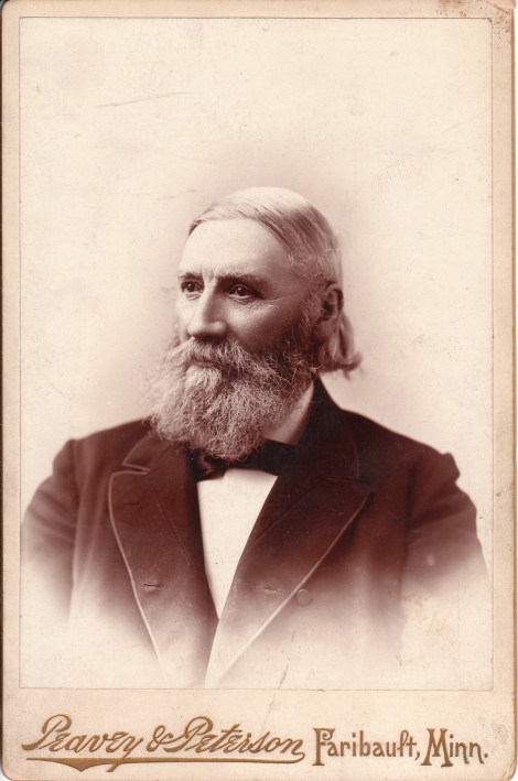 This Cabinet Card photograph is an image of a very interesting looking man. His long hair and beard makes him look like Willie Nelson. This gentleman is from Faribault, Minnesota; or perhaps he was from elsewhere and just “on the road again”. The photographic studio was Peavey and Peterson of Faribault, Minnesota. Louis Peavey (c1832-1902) was a photographer active in Decorah, McGregor, and Ossion, Iowa (1864-1870). He opened a studio in Faribault, Minnesota in 1870 and partnered with Christian Peterson in about 1878 until near the end of the 1890’s.