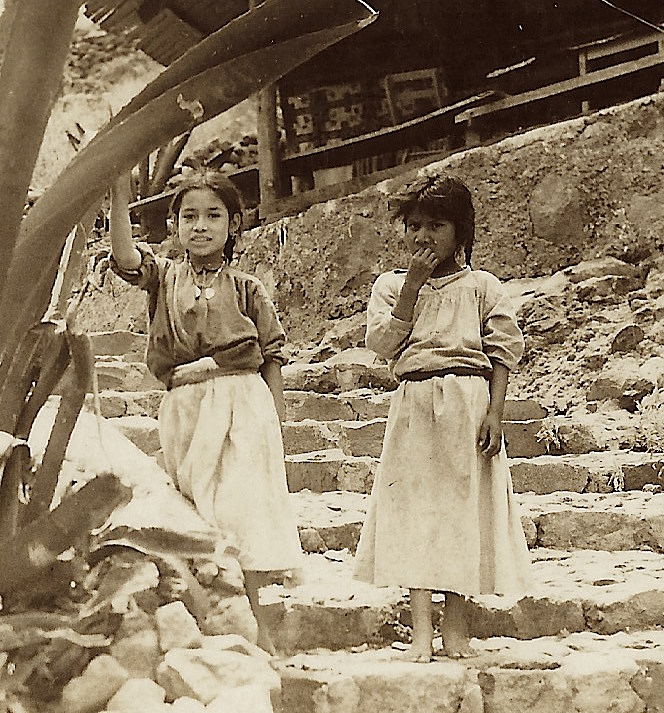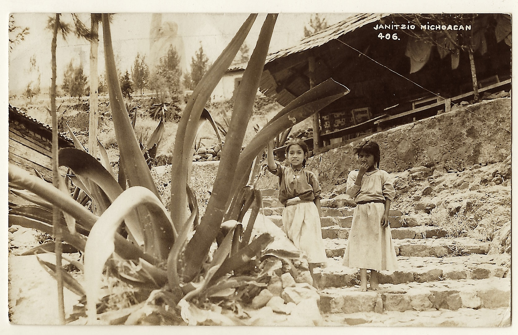 This ethnographic vintage real postcard features two young native Mexican girls posing on the steps of some sort of structure. The girls are posed next to a large cactus. The girl on the left is adorable and wearing a nice smile and a necklace. She seems to be resting her hand on the cactus. The darker girl on the right has her hand on her face. She is blocking the camera from adequately providing a good photo of her face. The girls are both barefoot. This photograph was taken in Janitzio, Michoacan. The Isle de Janitzio is the main island on Lake Patzcaro. The lake is located in the state of Michoacan, Mexico. The word “Janitzio” translates to “where it rains”. The town is known for it’s “butterfly fishermen” who catch the local favorite, “pescado blanco”. Wikepedia notes that some of the people of Janitzio are of indigenous descent. These people are known as “Purepecha”. These girls may be members of this ethnic group. This postcard is part of a series (no. 406). The postcard was published by Kodak Mexicali. The postmark on this card appears to be “1944”. This vintage postcard is in very good condition (see scans). SOLD