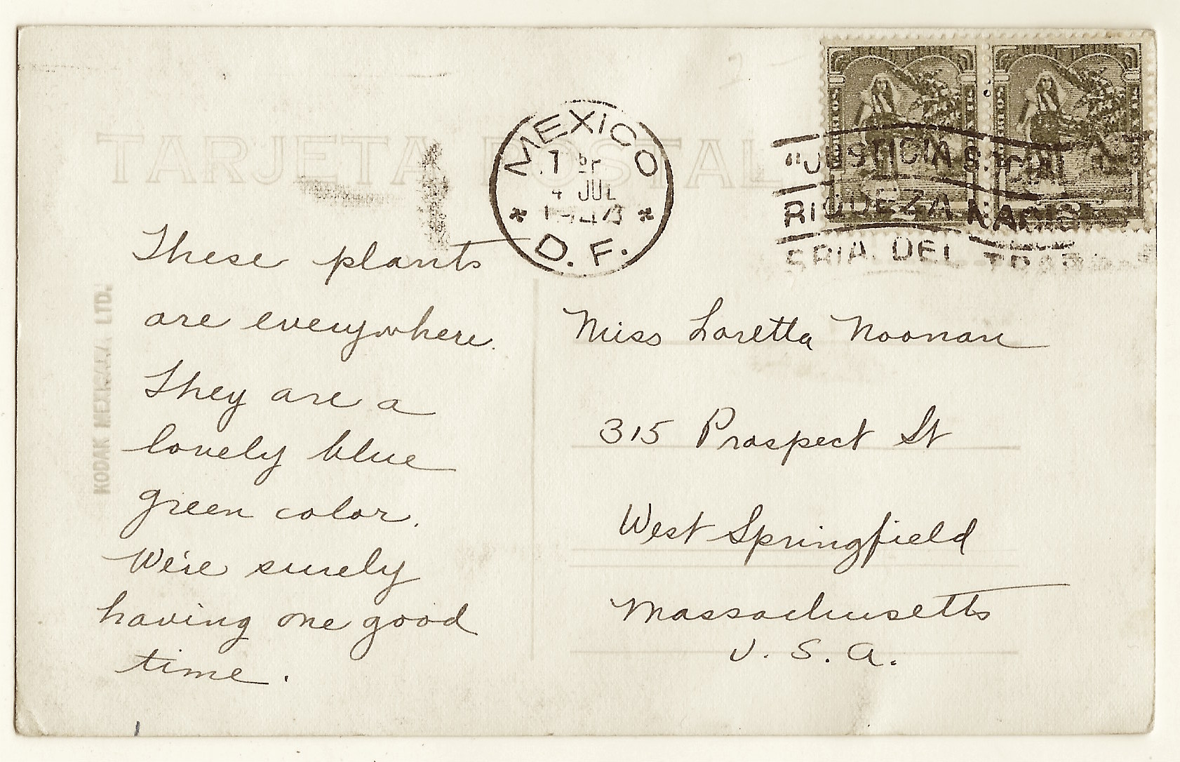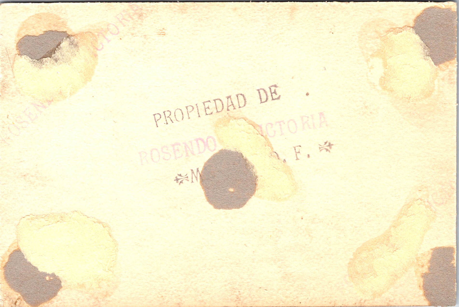 This vintage real photo postcard features a young boy posing next to his burro. The child is wearing sandals and holding a large at his side. This card is on Kodak-Mexico paper. Note the paper residue on the reverse of the postcard. It is a souvenir from the card’s time spent residing in someone’s postcard album. Overall, this postcard is in good condition (see scans).