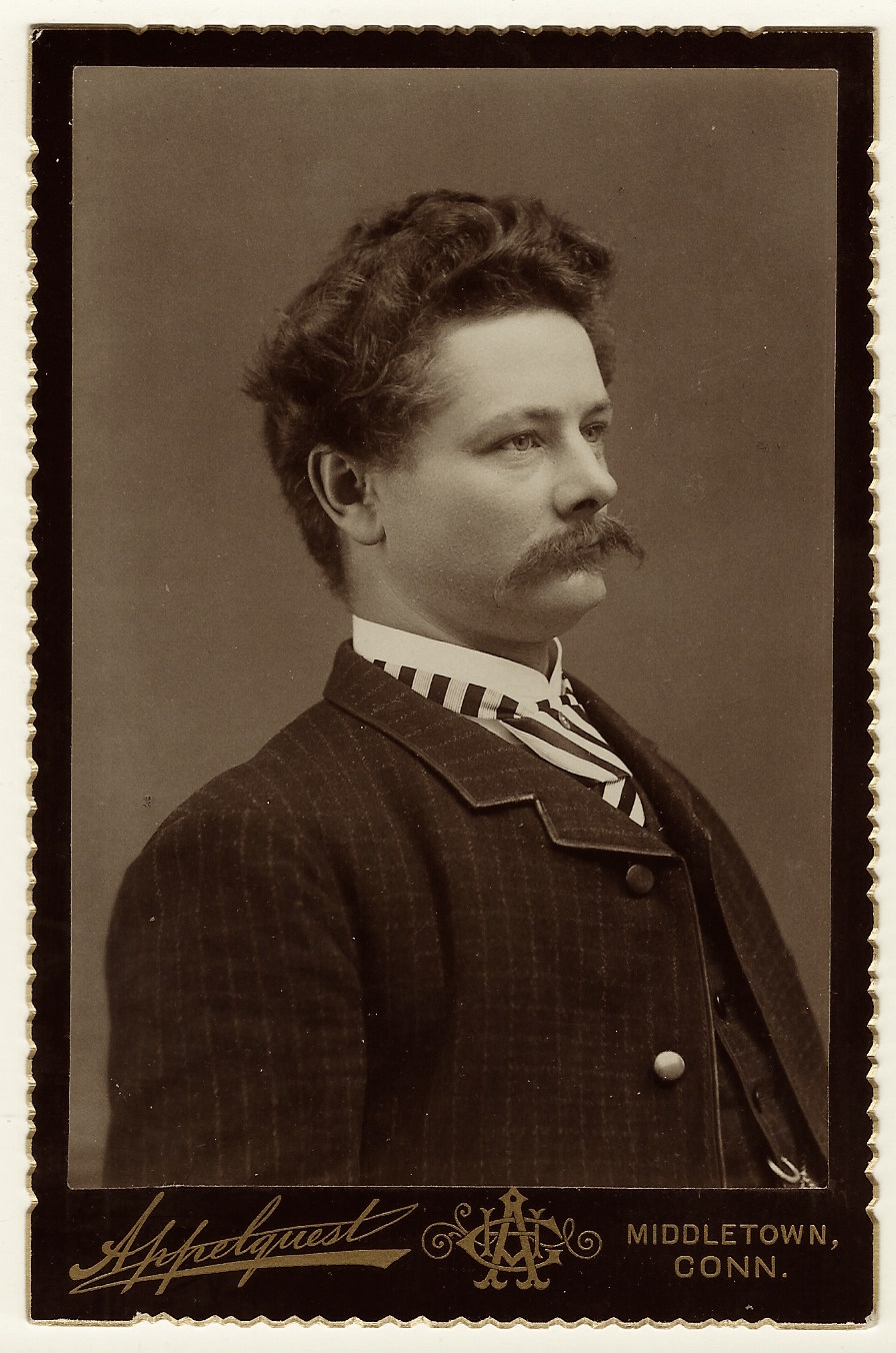The handsome man in this cabinet card portrait is well dressed and well groomed. He has a terrific mustache and big hair. His striped tie is quite lovely but quite loud and he may be in danger of being ticketed by the fashion police for wearing a striped tie with a plaid jacket. Gideon H. Appelquest (1859-1902) immigrated from Sweden in 1876 and settled in Middletown. He was a photographer in the town from the 1880’s until about the time of his death. His wife Emily, took over the studio after Gideon’s death and operated it for another two years. The couple had two children; Jerome (born 1888) and Alva or Olga (born 1891). To view more photographs from this studio, click on the category “Photographer: Appelquest”.