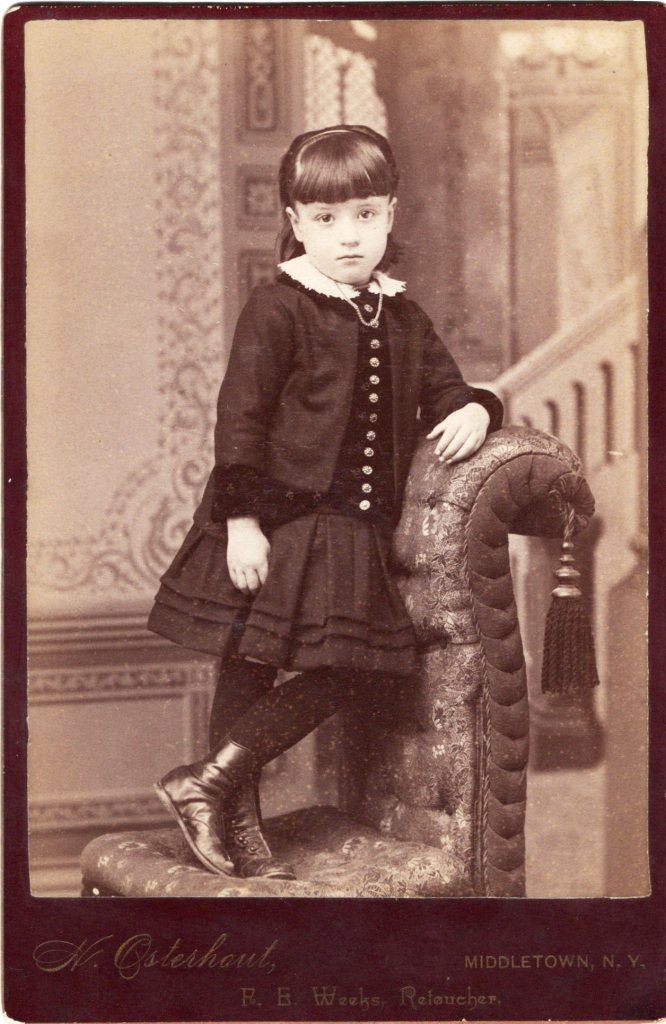This cabinet card portrait features a full portrait of an adorable little girl. She is standing on a chair and appears a bit dubious about the experience of being photographed. She is smartly dressed. The photographer of this image is H. Osterhaus and the retoucher is R. B. Weeks. The photograph was taken at Osterhaus’s studio in Middletown, New York. (SOLD)