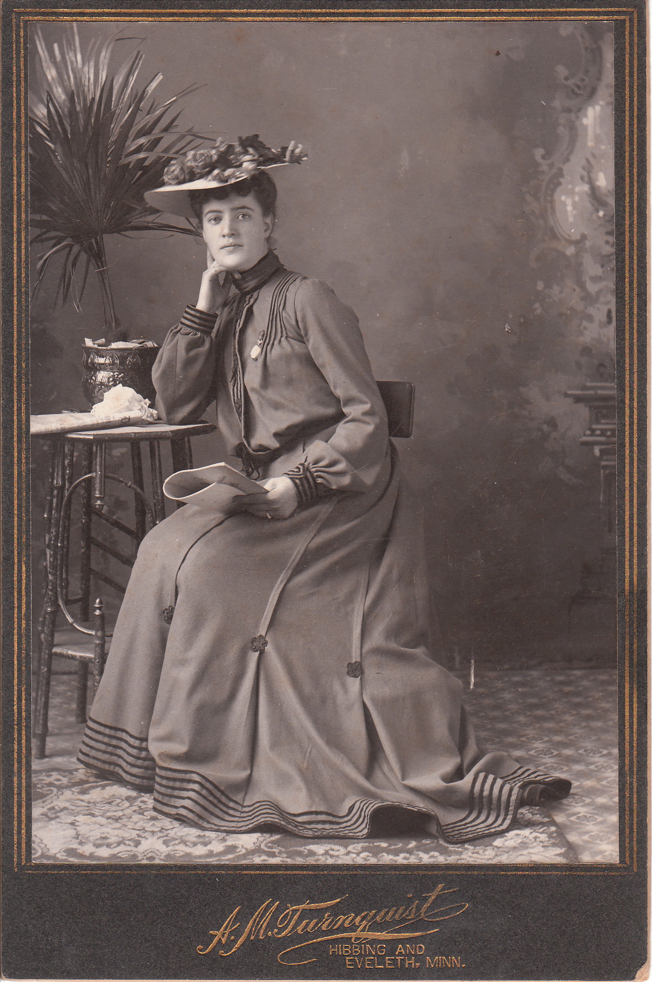 The subject of this photograph is a very pretty woman, stylishly dressed and wearing a flowered hat at the photographic studio of A. M. Turnquist, located in either Hibbing or Eveleth, Minnesota. The woman appears quite natural and relaxed as she sits at a table with a potted plant in the background. What are those papers that she is holding? Is it possibly a script for a play, a magazine, or divorce documents? The answer is lost to time. A. M. Turnquist is more specifically, Axel M. Turnquist who was born in Sweden, and trained in photography in Duluth, Minnesota. He operated photographic studios in many Minnesota towns including Tower, Virginia, Eveleth, Hibbing, and Aurora. He worked as a photographer form the 1880’s through 1923. To view other photographs by Turnquist, click on category “Photographer: Turnquist”. (SOLD)