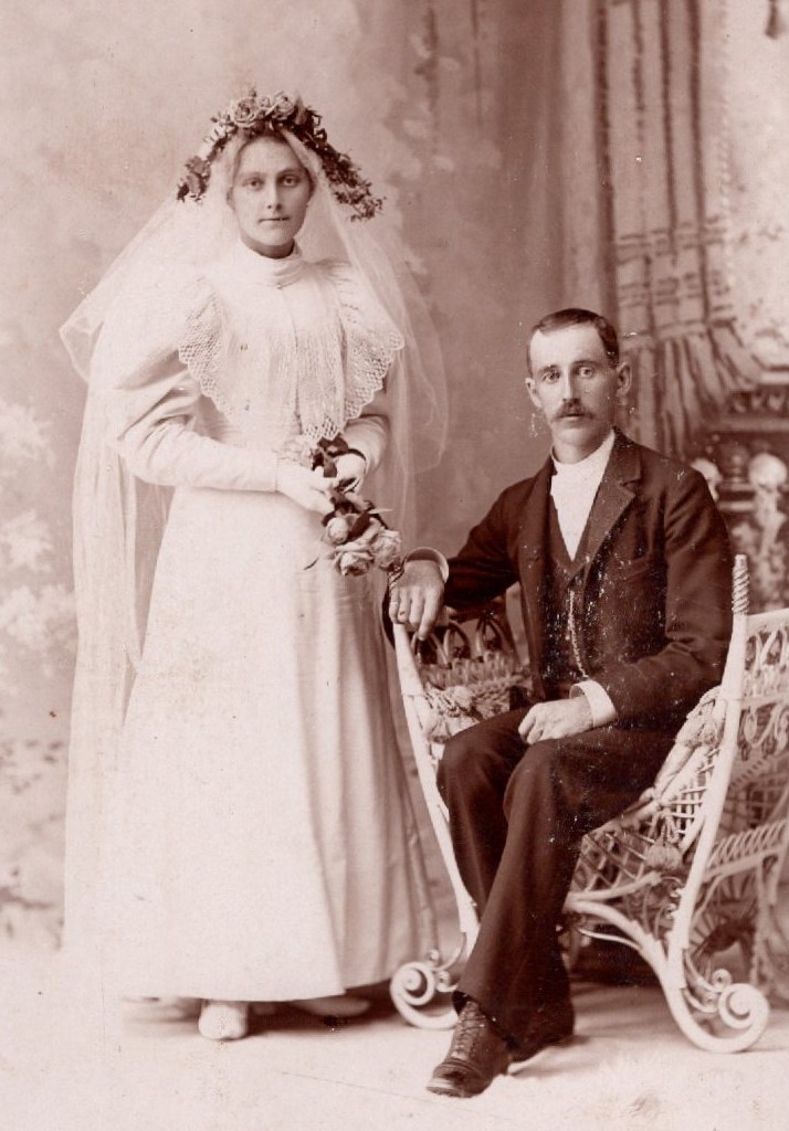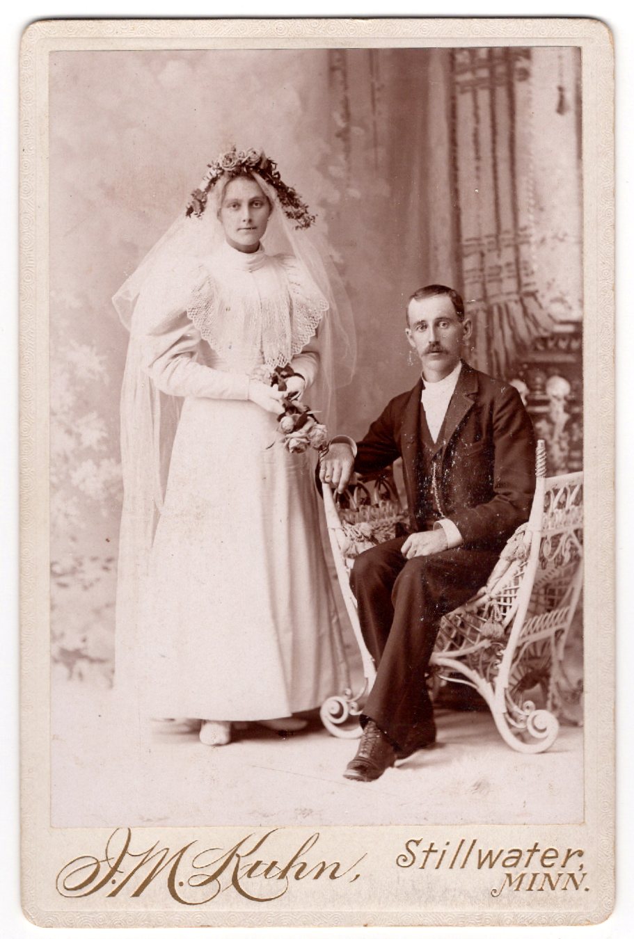 A bride and groom pose for their wedding photograph at the studio of J. M. Kuhn in Stillwater, Minnesota. The groom looks as if he is in a state of shock on this momentous day. Perhaps he’s experiencing “cold feet syndrome”. His bride seems a bit happier and is wearing a very flowery veil. John M. Kuhn (1855-1910) operated photography studios in Stillwater between 1882 and 1897. Afterwards, he owned a studio in Saint Paul, Minnesota. At times, he was partners with his brother Louis Kuhn. Research reveals that John Kuhn took official photographs of guards and wardens at the Stillwater State Prison. SOLD