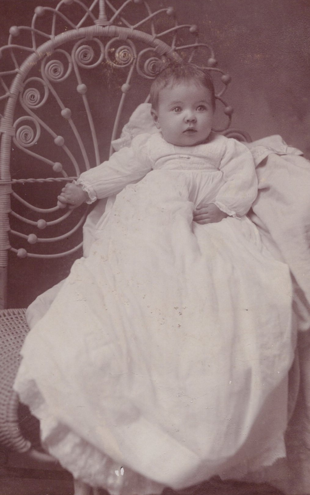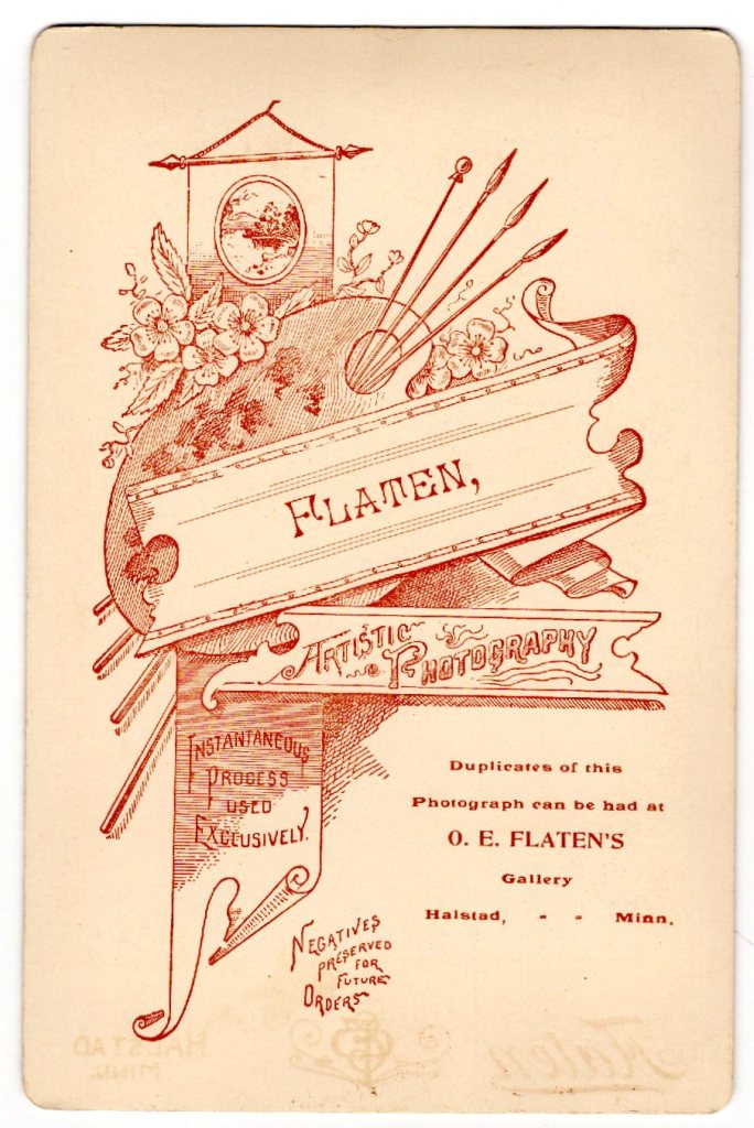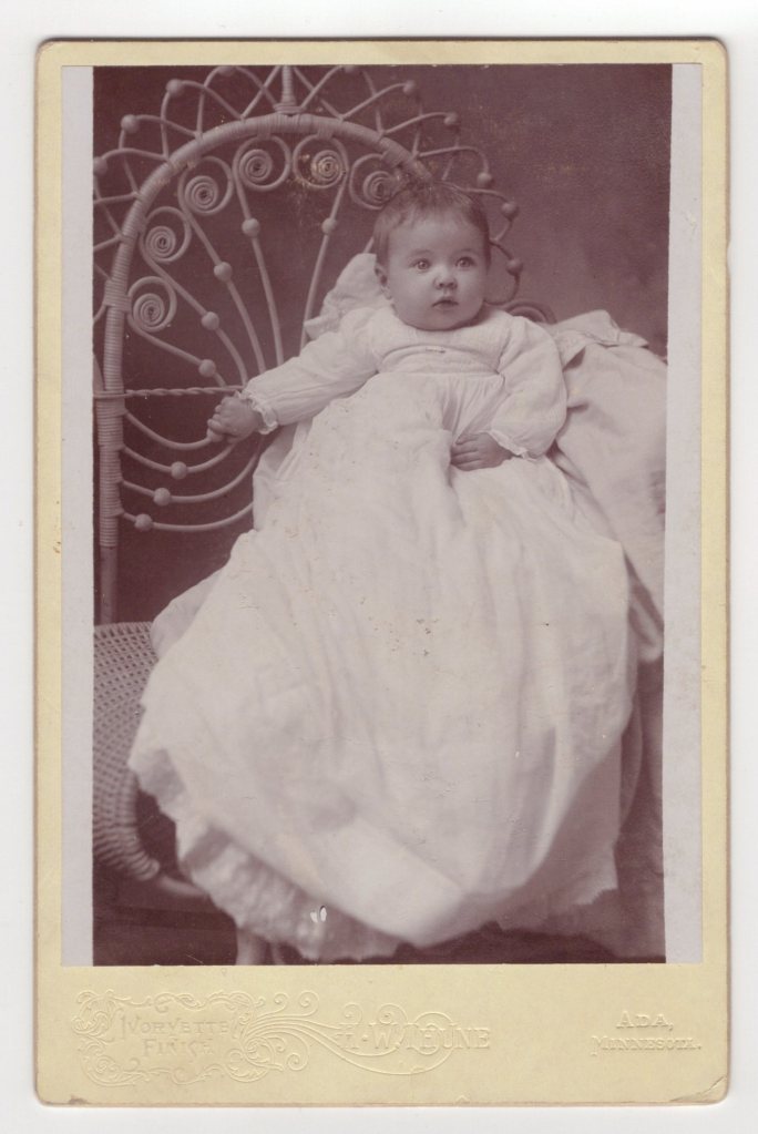 This cabinet card captures a very cute baby posing on a wicker chair. The baby is wearing a long gown and has a terrific sweet facial expression. The photographer is Halvor William Thune (1857-1932). He was born in Iowa of Norwegian native parents. He opened a gallery in Ada, Minnesota in 1883 and Thune still operated the gallery in the 1920’s. He was civically active and held a number of county and village offices including Mayor of Ada and Chief of the Fire Department. Thune also found time to operate his farm. This cabinet card has excellent clarity and is in good condition (see scans).