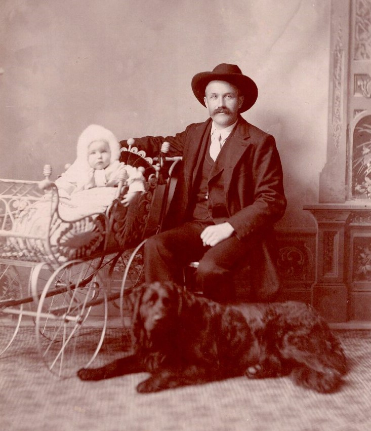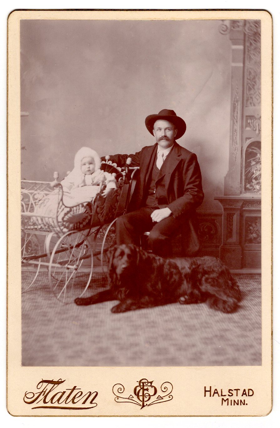A man in western clothing, poses for his portrait along with his baby and dog. His arm is wrapped possessively around the back of the baby’s carriage. Lying in front of the man, is his loyal dog. The dog looks like a Labrador Retriever, but the previous owner of this cabinet card suggested that it resembles a New Foundland. This image is charming and warm. Where is this gentleman’s wife? Did she die in childbirth or by disease? Is she camera shy?. The answer, of course, is unknown. The photographer of this image is O. E. Flaten. Flaten’s studio was in Halstad, Minnesota. He produced a number of interesting photographic portraits of people living in the western United States. (SOLD)