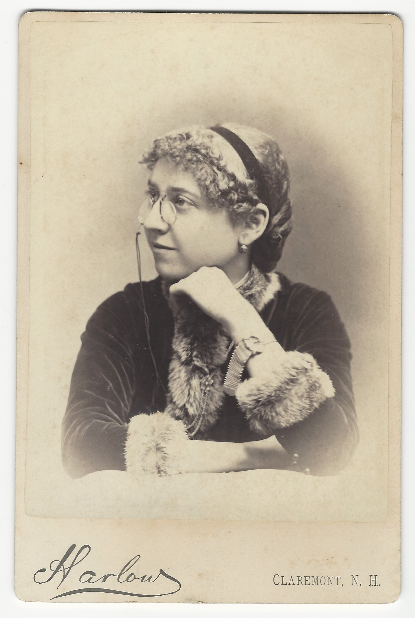 Alonzo Harlow is the photographer of this cabinet card image of a woman wearing glasses. Note that the eyeglasses are lacking temples (the part of the frame that rests on, or are hooked around, the wearer’s ears. This was the style of eyewear at the time that this photograph was taken. The woman is wearing a fur trimmed dress or jacket as well as a headband and earrings. This photograph was taken in Harlow’s Claremont studio. Alonzo Harlow is listed in the 1880 US census as being a native of Vermont and as living in Montpelier with his wife and a boarder. Alonzo (age 32) worked as a photographic artist. His wife Lucy (age 27) kept house, and the boarder, George Dale (age 23) also worked as a photographer. Alonzo was listed in the 1890 through 1892 Montpelier city directories as a photographer. The 1900 census found Harlow living in Boston, Massachusetts and working as a real estate clerk. To view other photographs by Harlow, click on the category “Photographer: Harlow”. This cabinet card portrait has gold beveled edges and is in excellent condition (see scans). The use of of gold edges was most common between 1885 and 1892.