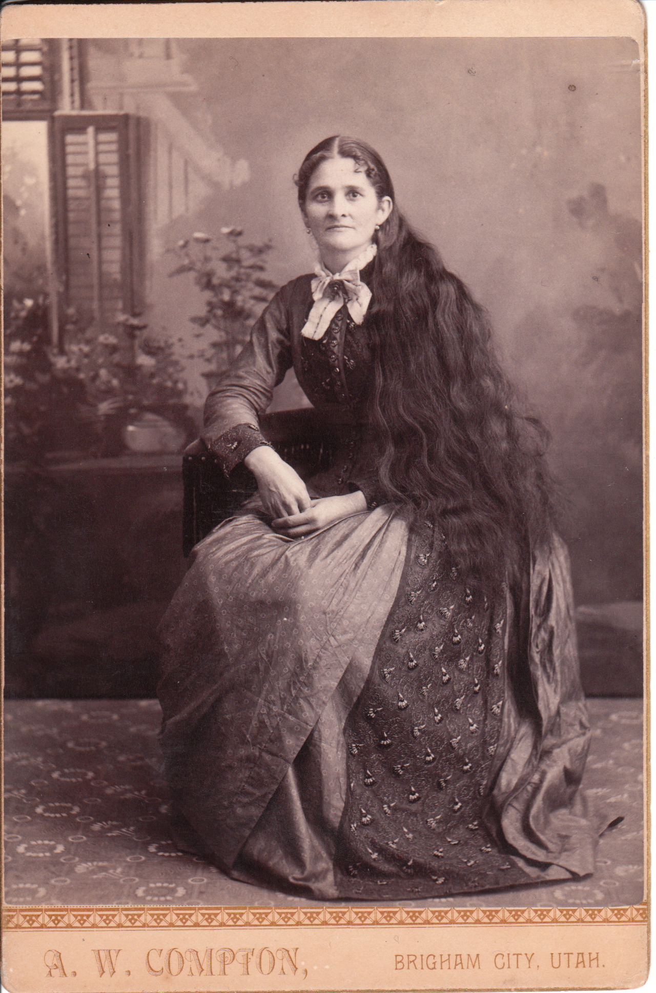 A woman with long hair and a long dress poses for her portrait at the A. W. Compton studio in Brigham City, Utah. Her dress has an interesting pattern which clashes with the studio’s carpet. The woman has a far away look in her eyes. Brigham City was founded by Mormon pioneer William Davis who first explored the area in 1850. Brigham Young, the church president, assigned Lorenzo Snow to create a self sufficient city at the site in 1853. Two years later, the town was named Box Elder. Brigham Young gave his last public sermon there and in 1877 the city was renamed in his honor. The photographer of this image was Alma Walter Compton. Utah State University has a collection of 90,000 photographs from the Compton Studio which was operated by three generations of the Compton family beginning in 1884. The collection is said to provide an illustrated history of agriculture, business, social life and education for the town of Brigham City over a span of nearly one hundred years. The Alma Compton House, located in Brigham City, is listed on the National Register of Historic Places.