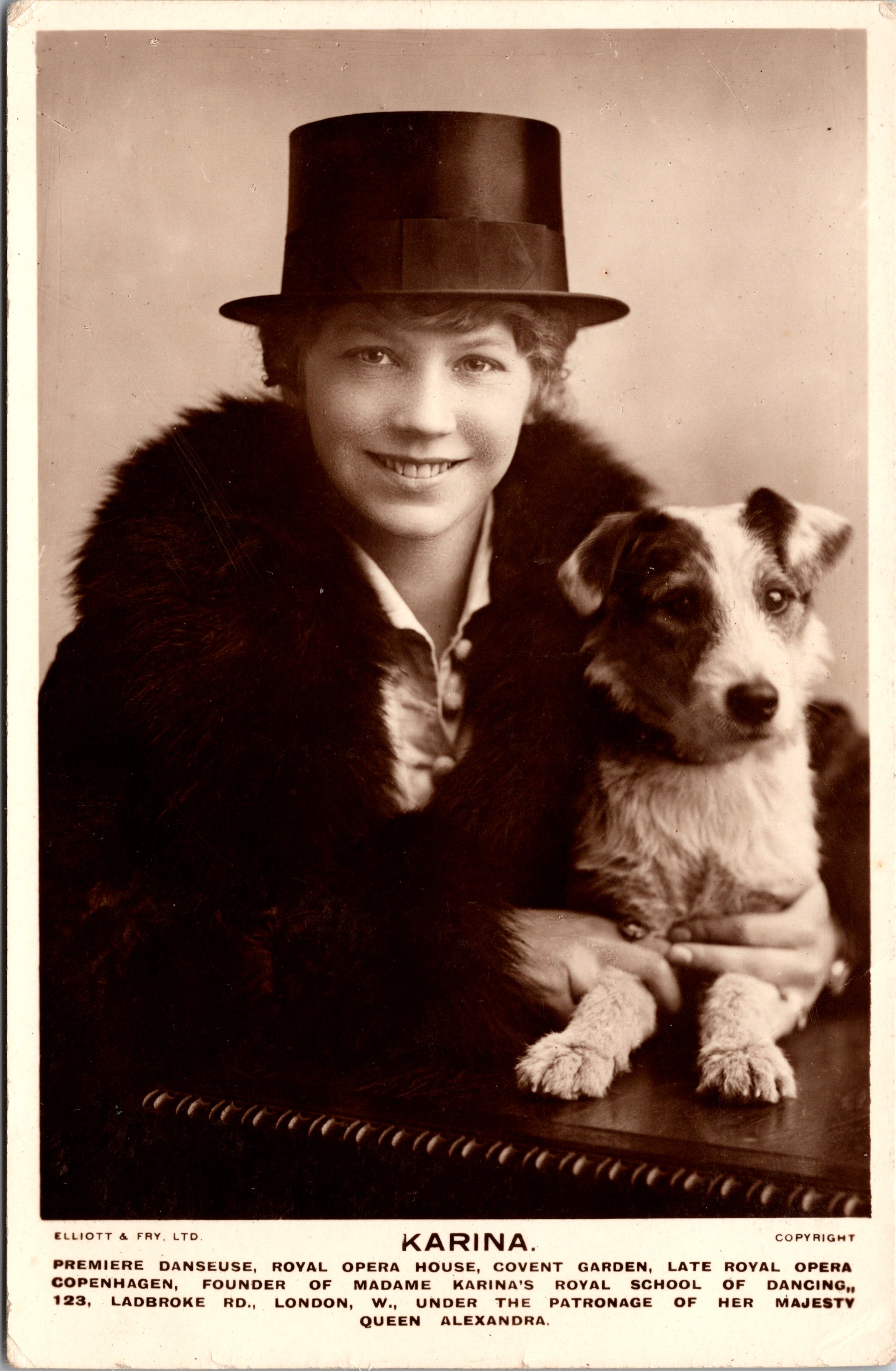 Karina. She was celebrity enough to use only her first name. More modern performers who are recognized by just one name include Elvis, Madonna, and Adele. Who was Karina? As the caption on the postcard asserts, Karina was the premiere dancer at the Royal Opera House and the founder of Madame Karina’s Royal School of Dancing. The school was under the patronage of Queen Alexandra (of Denmark). The Queen was a staunch supporter of the opera ballet from 1913 through the 1920’s. Karina was Danish and active in the 1910’s and 1920’s. Two portraits of Karina can be found in Great Britain’s National Portrait Gallery. The photograph seen on this postcard was taken by the esteemed studio of Elliott & Fry. This Victorian photographic studio and photographic film manufacturer was founded in 1863 by Joseph John Elliott and Clarence Edmund Fry. For an entire century the studio took and published images of leading Victorian luminaries from the fields of science, public service, art, politics, as well as celebrities of the day. SOLD